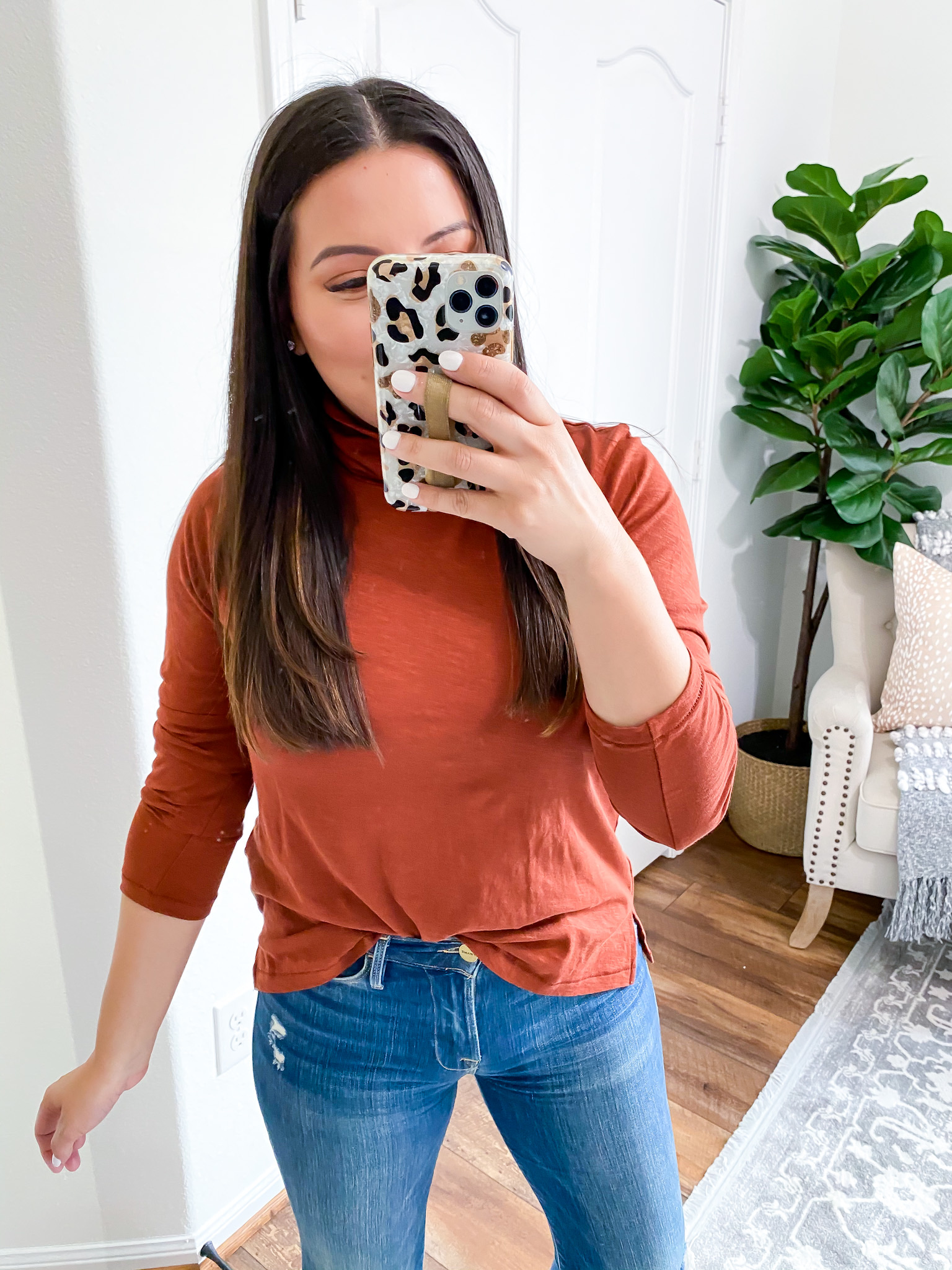 First up is this lightweight mock turtleneck. It might be my favorite. It’s currently 30% off making it ONLY $22! I love this brown, but it comes in black too. It’s selling out fast though. I am wearing a small and it fits comfortable, so I’d say it runs tts. This one is a keeper for sure.
