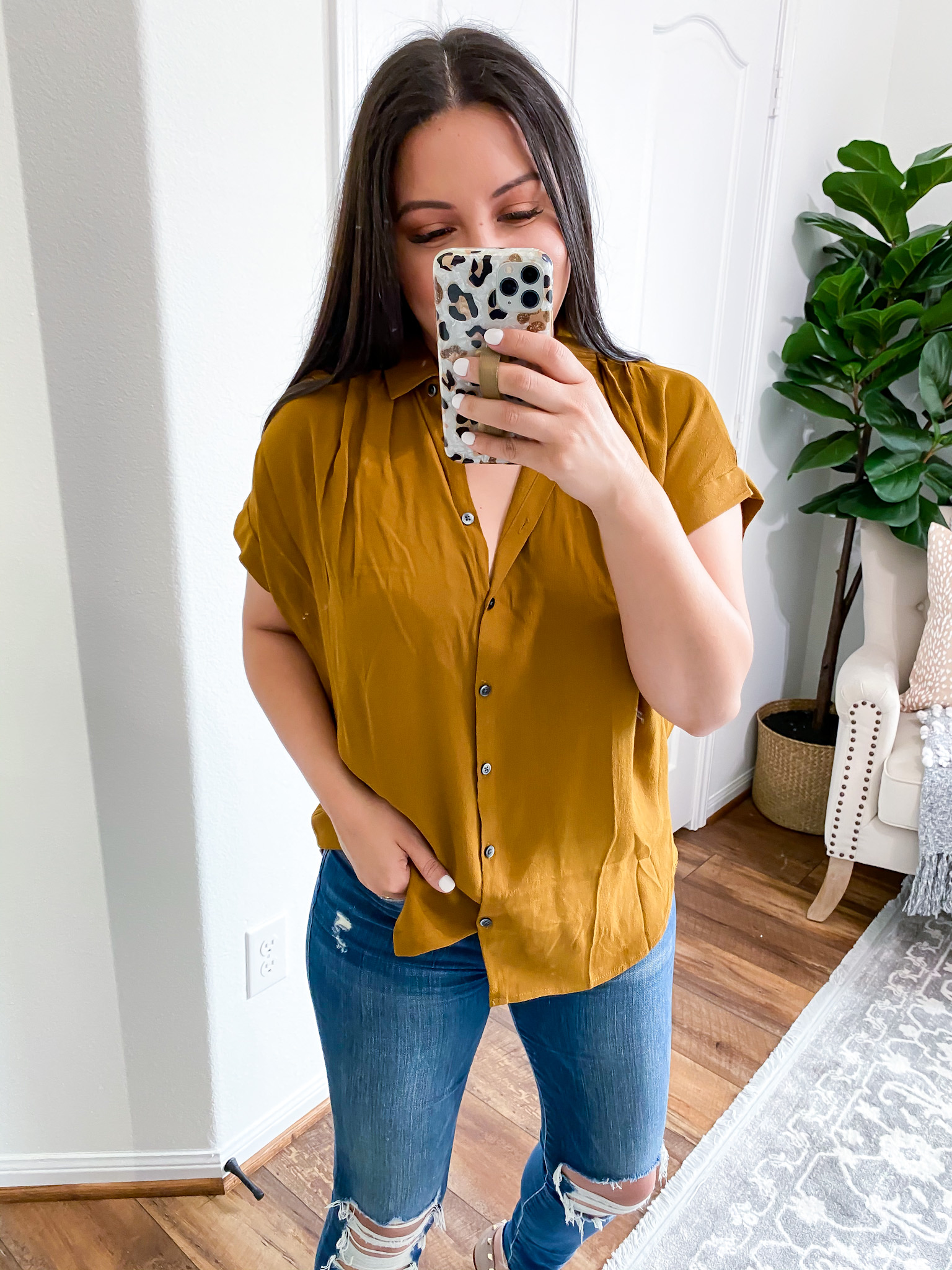 I love a good drapey top and this one comes in one of my favorite colors. It’s a little more deeper than the typical yellow that I like, but I still love it. I am wearing a small and as you can see it runs a little loose, but in the perfect way. This is the perfect year round blouse to dress up or down. I love the pocketless clean front for an effortless dressier vibe. Oh and it’s 30% off! This is a keeper, I love the fit.