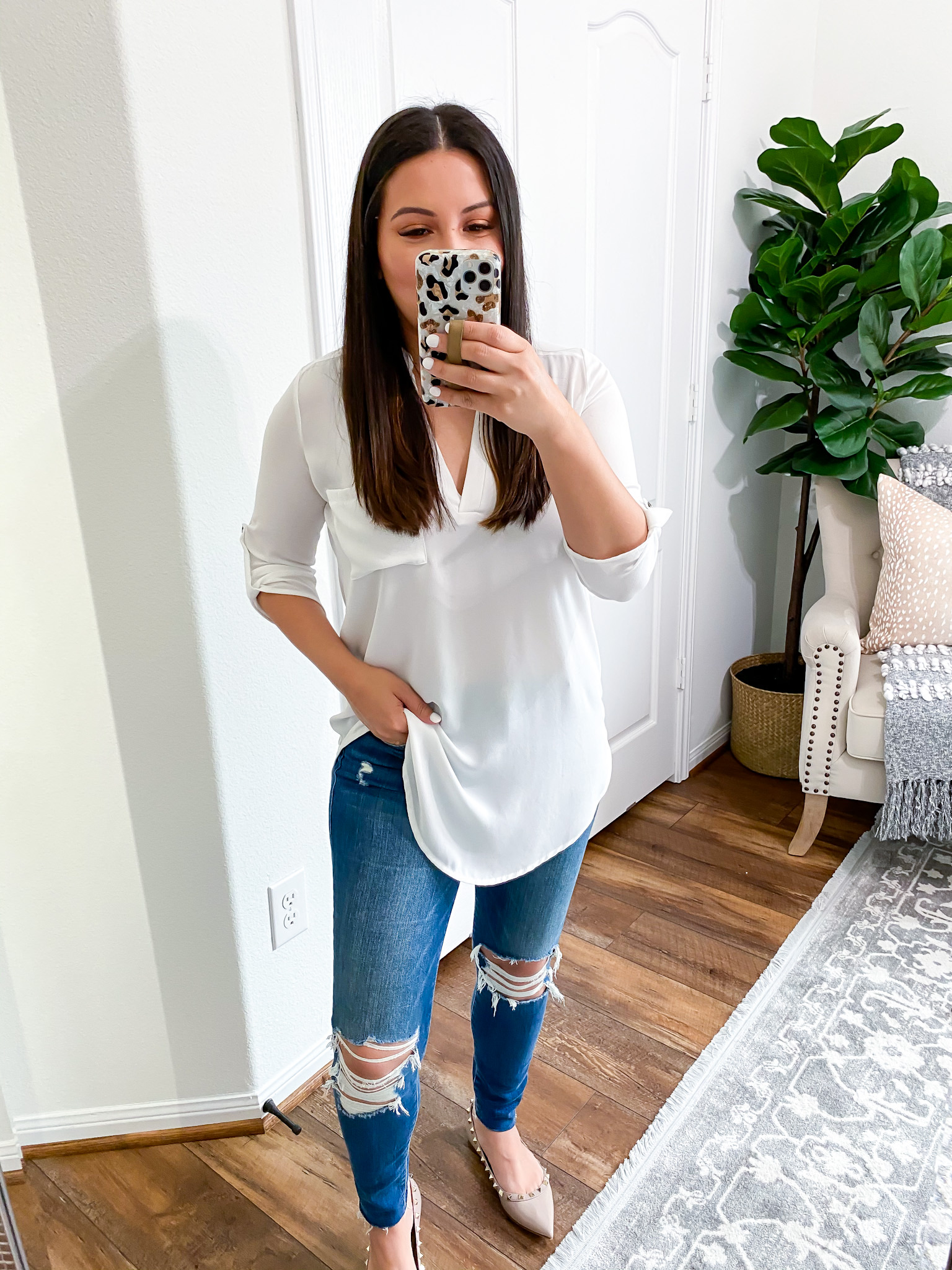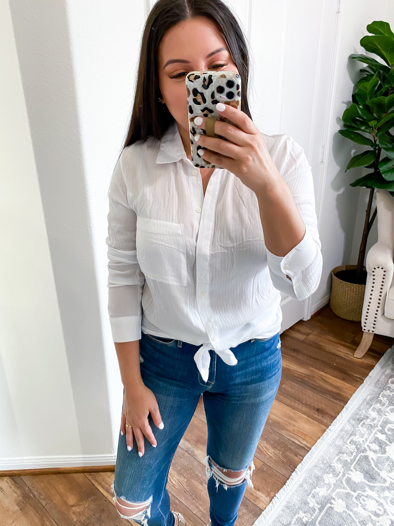 This lightweight classic white button down is another closet basic. I tied it up for a slightly different look. I ordered a small, but this one is a little small in the chest area. I think going up a size will also be best for a looser more relaxed fit. So, I will be trading this one out for a medium instead, but I love the weight and subtle texture in this.