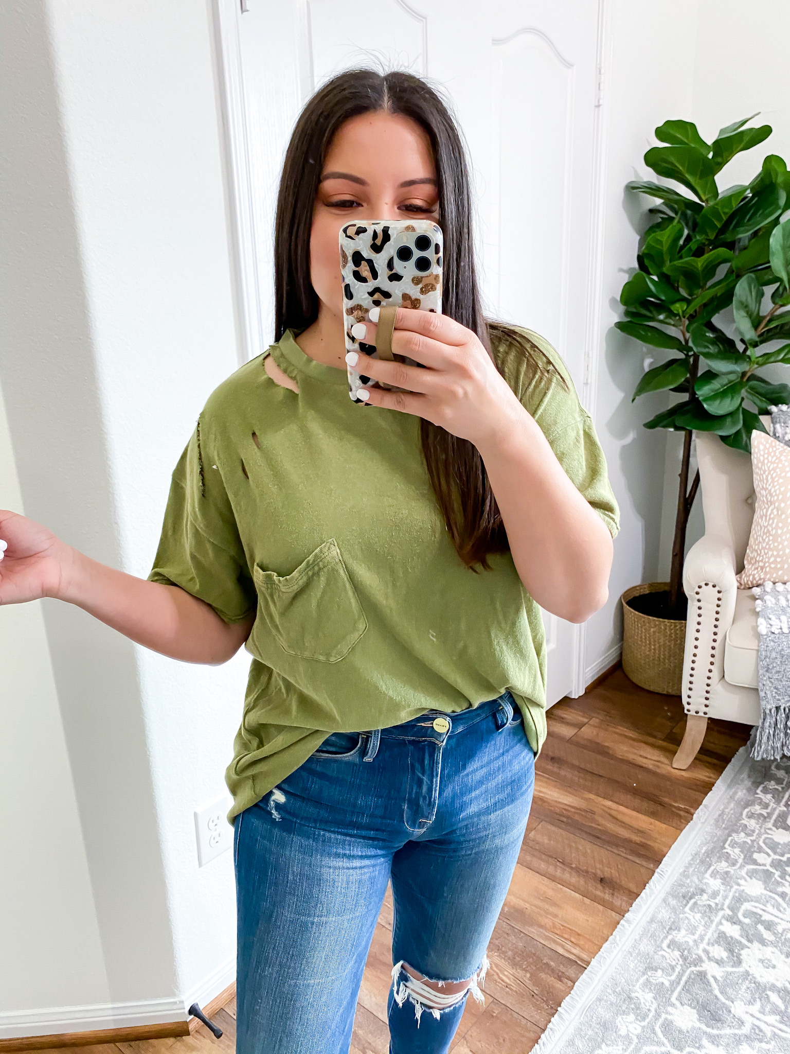 Last but not least is this distressed tee. I bought some similar ones last year but they sold out so fast, so when I say this one I knew I had to try it out. The fit is the same but the distressing is different and it’s on sale for UNDER $40!! It runs big, I am wearing a small here but love the oversized look. I will be keeping this one and going to order another color or two. I love a good distressed tee.