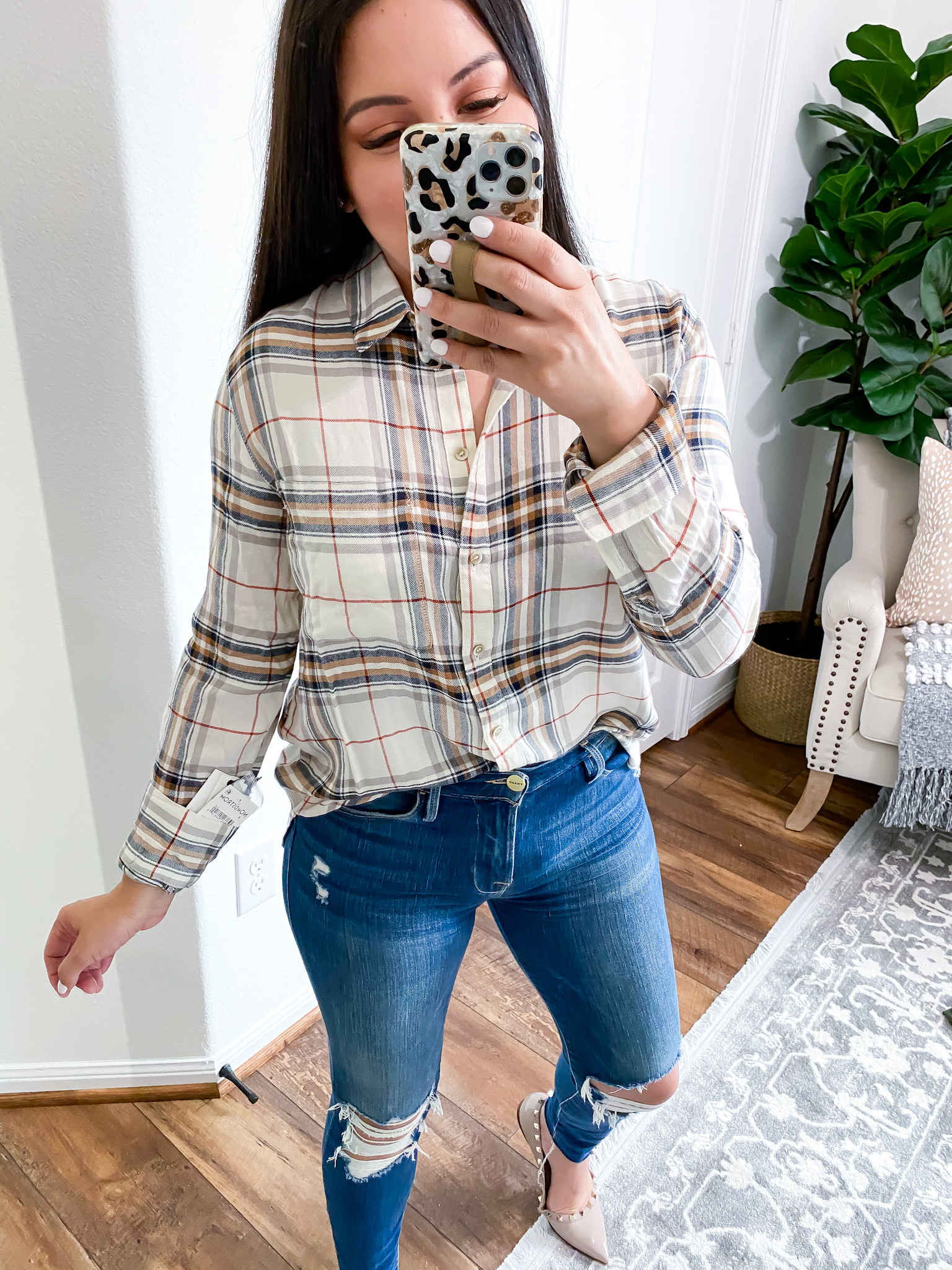 I’ve said it a 1000 times, if you don’t have a good plaid button down for fall you need one. It’s a fall closet staple and this one is so soft. It comes in 7 different colors and feels so good. I know I have a ton of plaids, but I love the way this one feels and fits, so it’s a keeper too. I ended up ordering this one in small and medium(wearing a small in this pic) and decided to keep the small, so it runs tts.