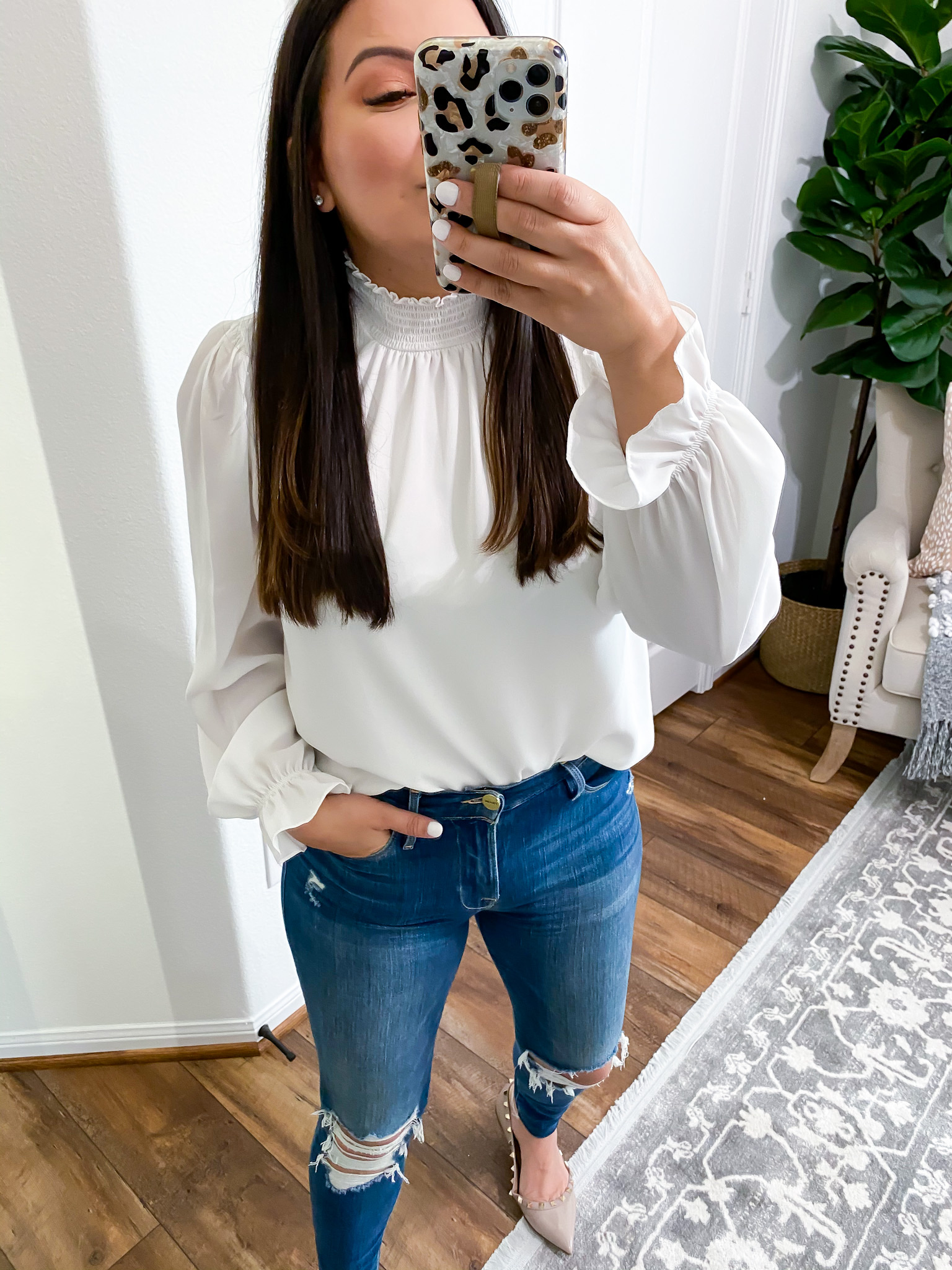 Next up is this smocked neck long sleeve blouse. It’s so cute and perfect for the office or a holiday event. The neck detail is very flattering and the sleeve detail is so fun. It comes in 6 colors. The leopard is so fun too. I am wearing a medium and think the small would have been fine too. So, I think it runs tts. I might swap this one out for a small, but I love it and will be keeping it just want to get the correct size.
