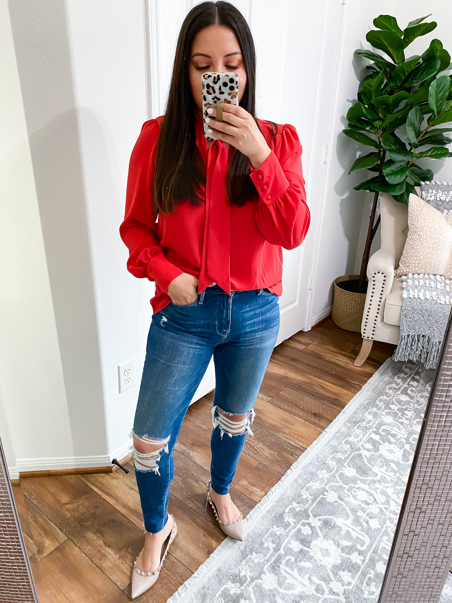 This tie neck blouse is 40% off and comes is the prettiest color. This one has a lot of versatility too. I could see it styled with a pair of polished dress pants and a skinny belt too. The details are perfect and it fits tts, I am wearing a small. I will be keeping this one for sure, I love this color.