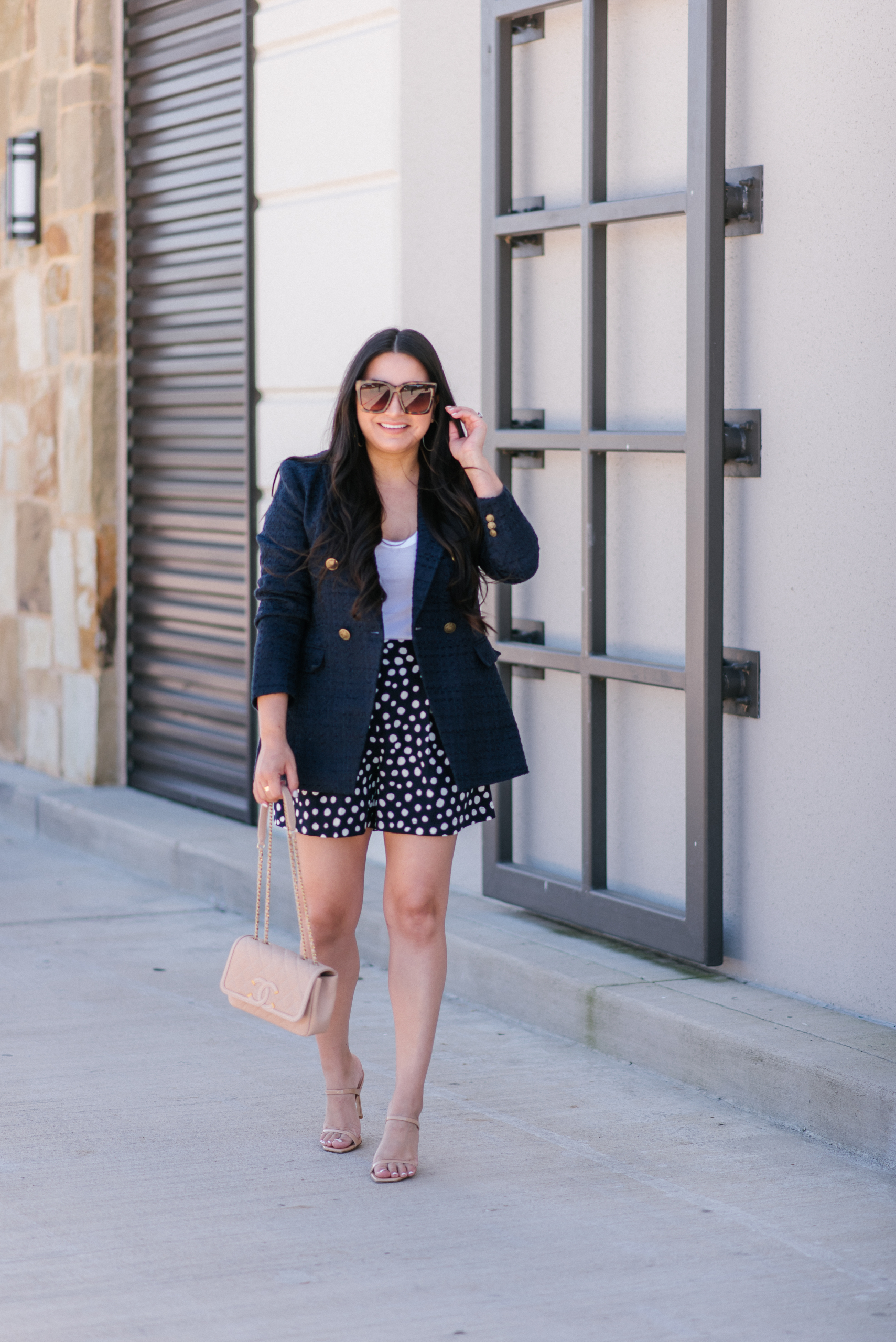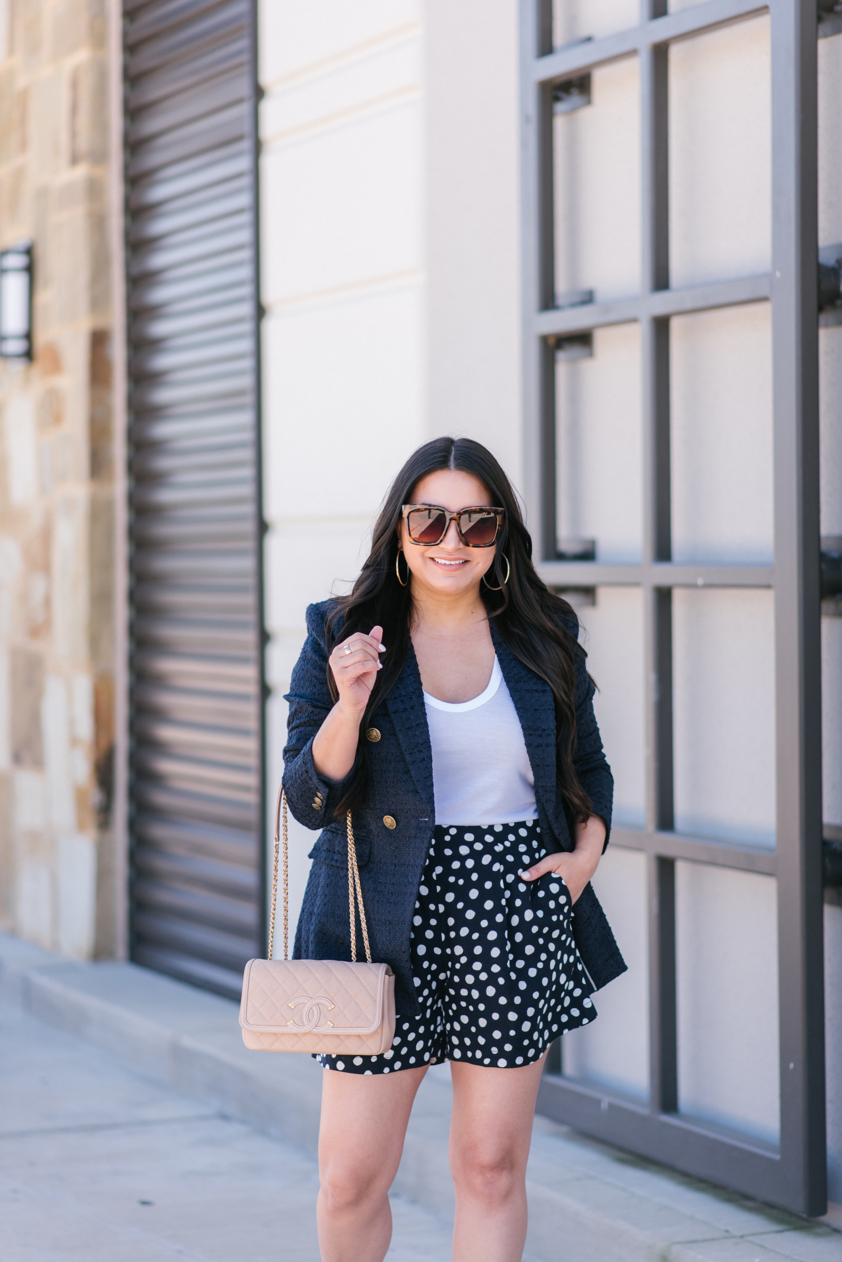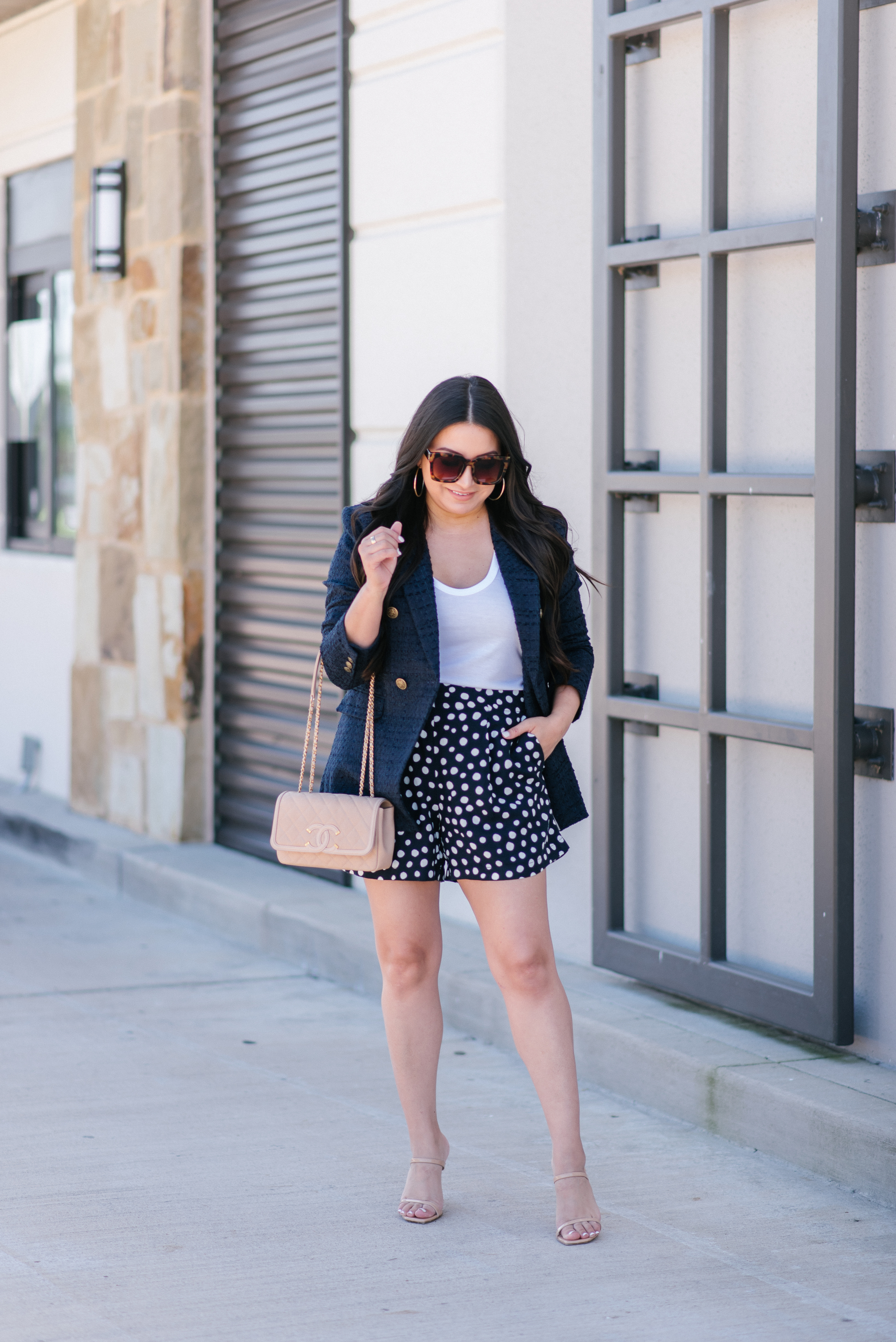 Tank | Blazer | Shorts | Heels | Sunglasses | Earrings | Handbag