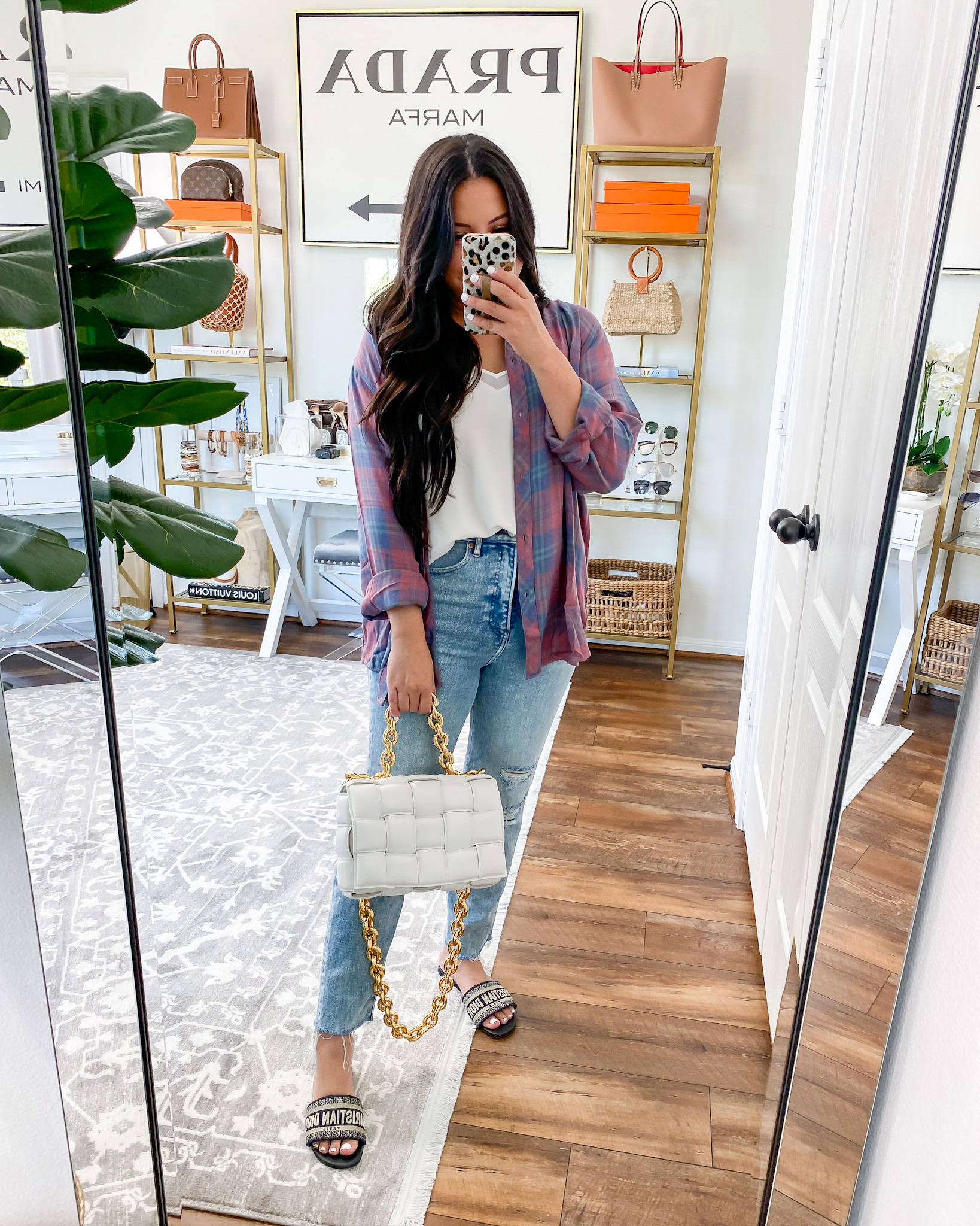 Cami | Plaid | Jeans | Sandals – Dior | Handbag | Rug | Phone Case
