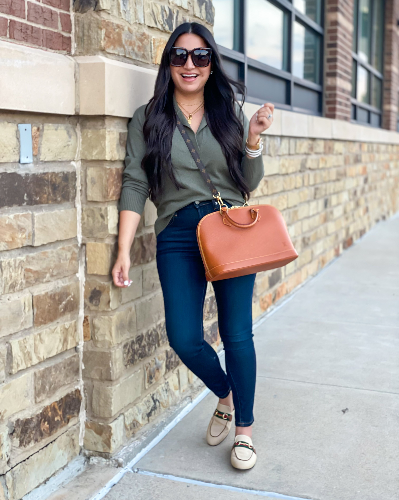 Sweater(similar) | Jeans | Shoes – up half | Sunglasses | Handbag