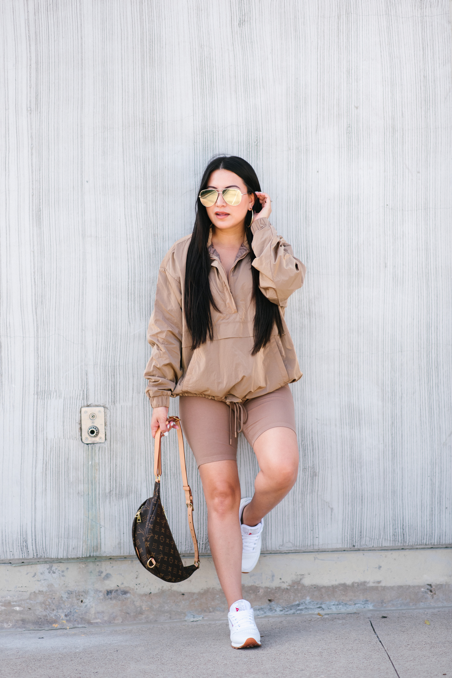 Bike Shorts | Jacket | Sneakers | Sunglasses | Earrings | Handbag