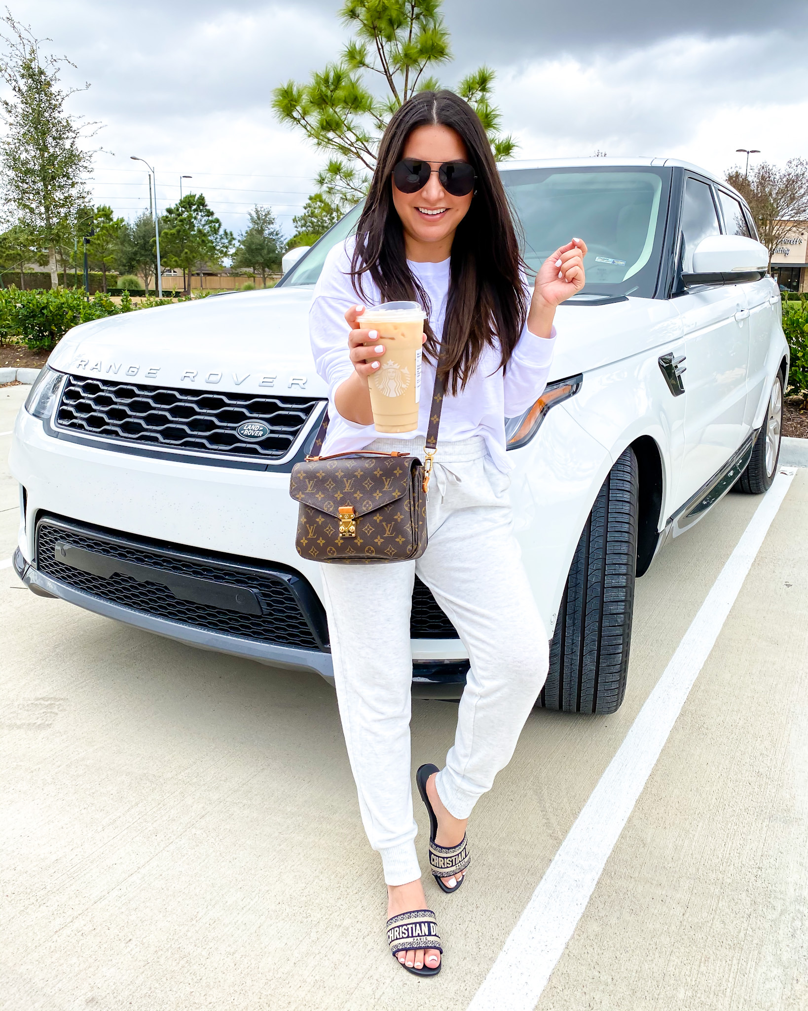 Tee – small | Joggers – medium | Sunglasses | Handbag | Sandals – Dior