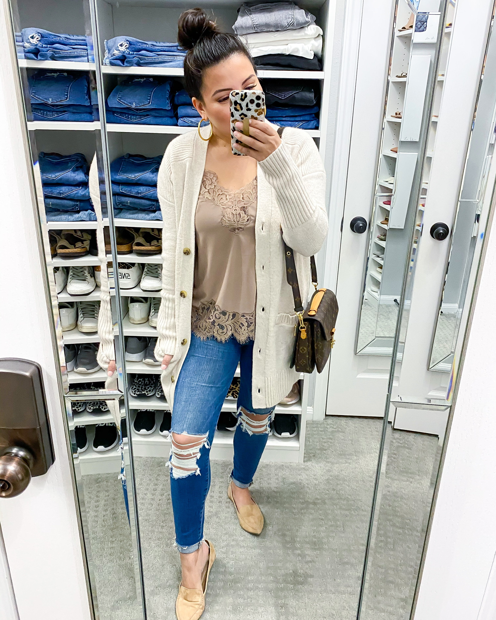 Cami – small | Cardigan – small | Jeans – 2 short | Flats – tts | Earrings | Phone Case | Handbag