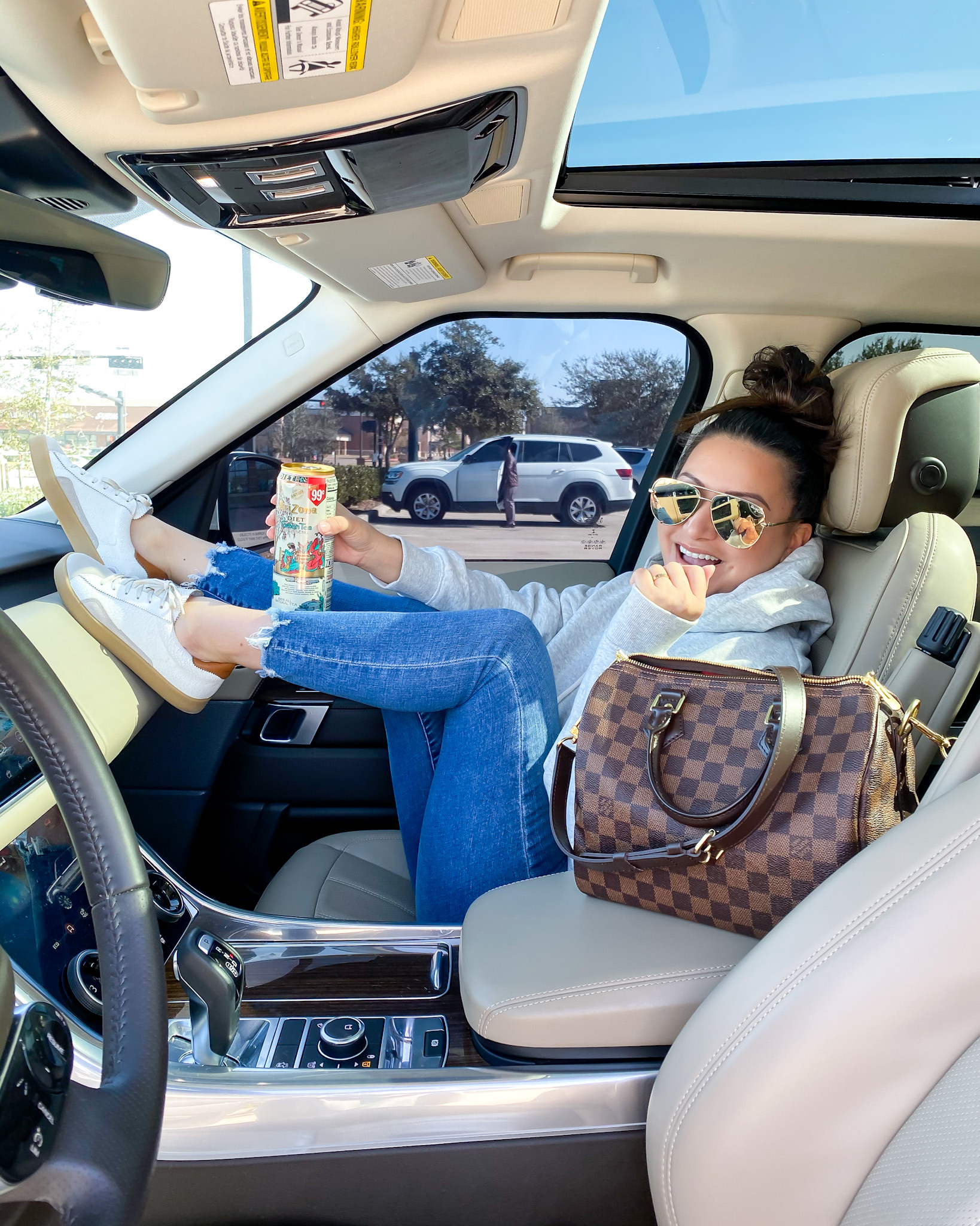 Hoodie – medium | Jeans – 2 short | Sunglasses | Sneakers – down half | Handbag