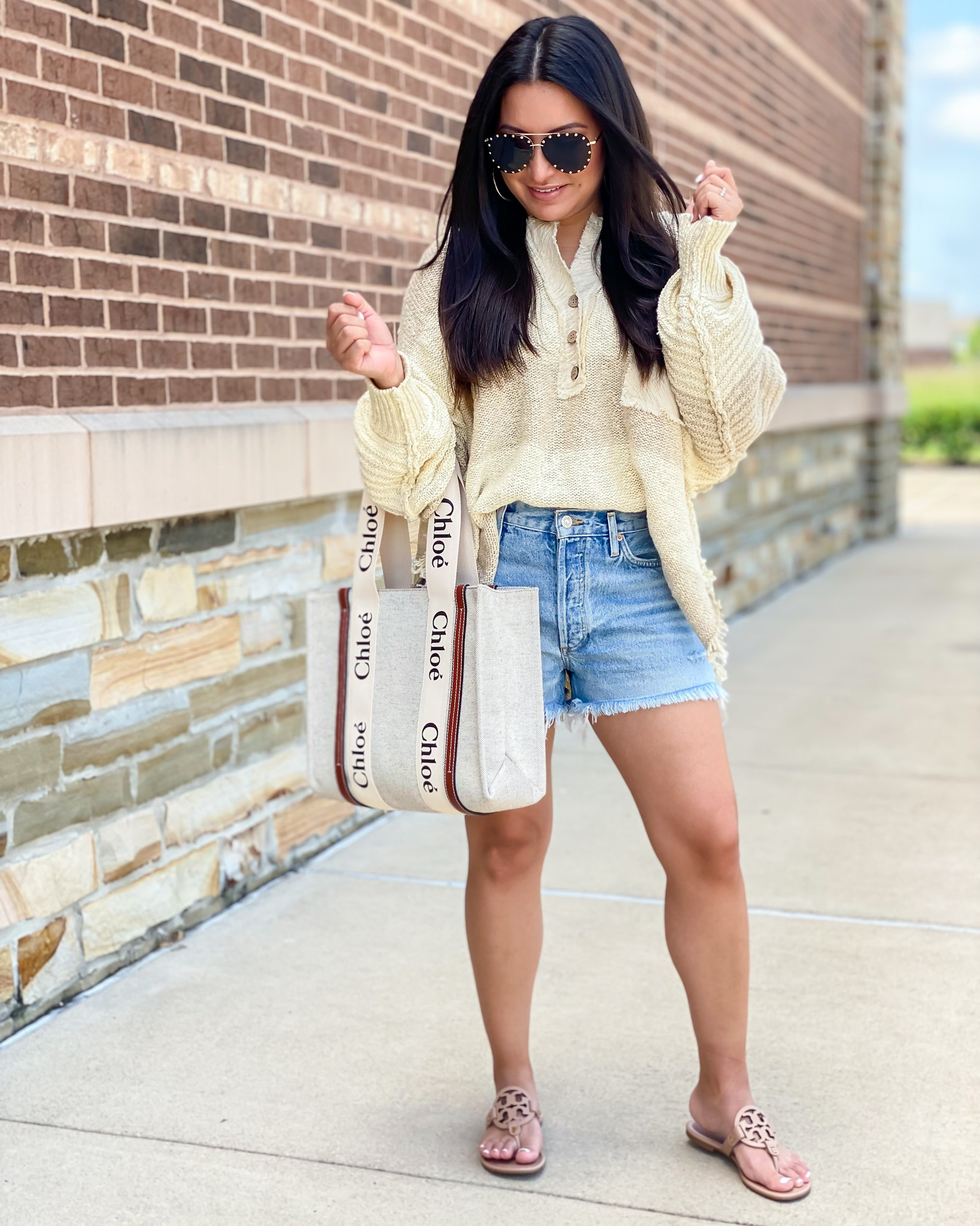Sweater | Shorts | Sandals | Earrings | Sunglasses | Handbag