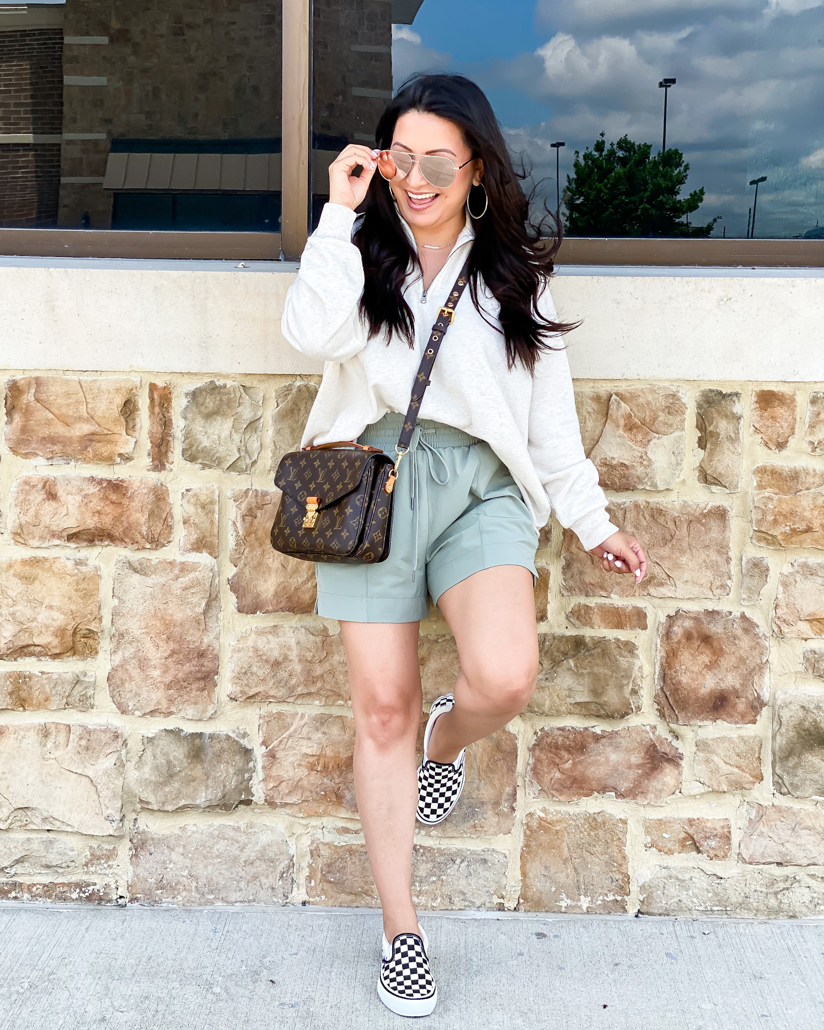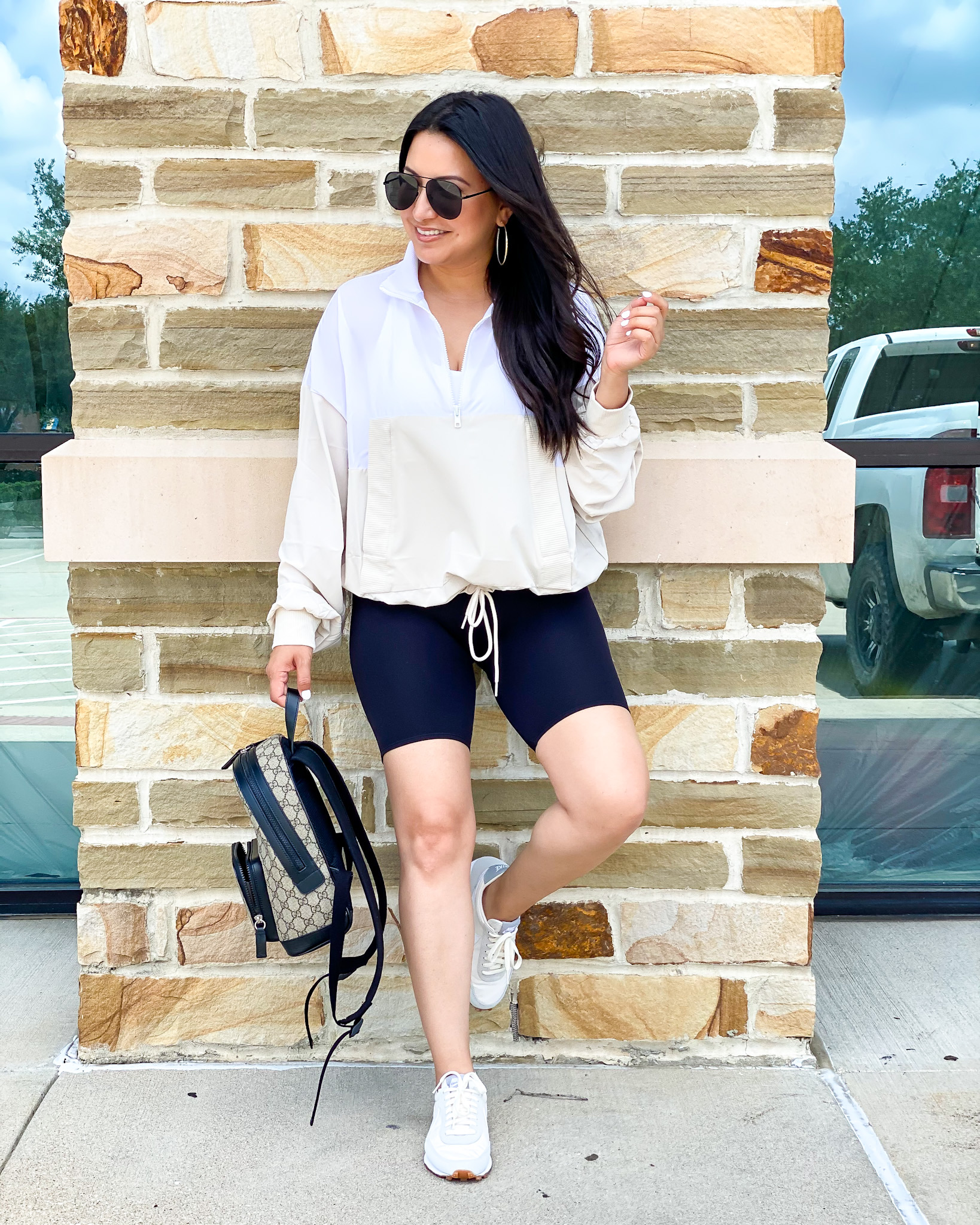 Pullover | Biker Shorts | Sneakers | Earrings | Sunglasses | Handbag