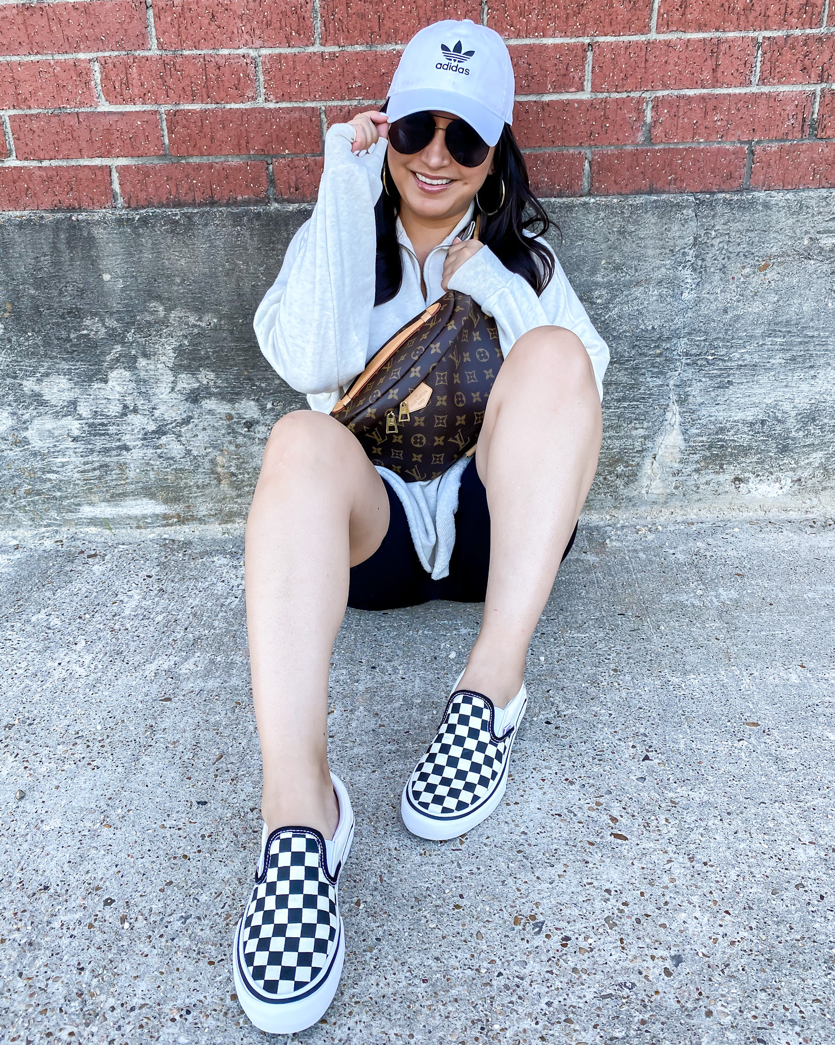 Pullover | Biker Shorts | Sneakers | Earrings | Cap | Sunglasses | Handbag
