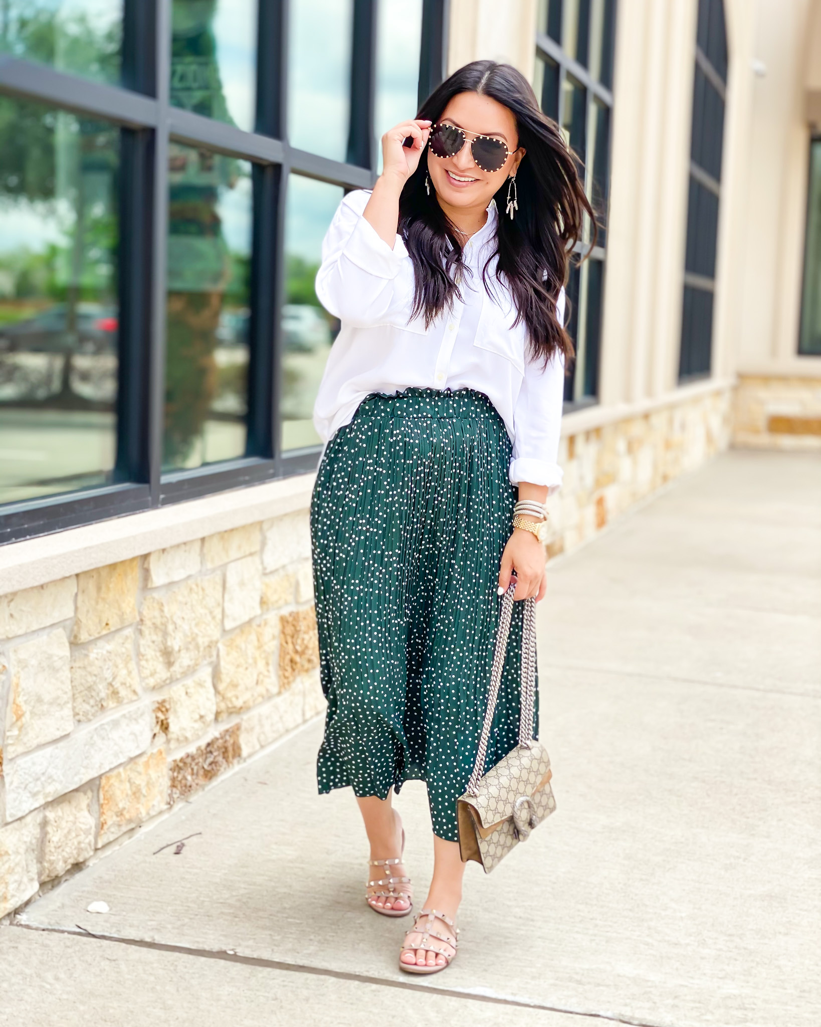 Blouse | Maxi Skirt | Valentino Sandals | Earrings | Sunglasses | Watch | Bracelets | Necklace | Handbag