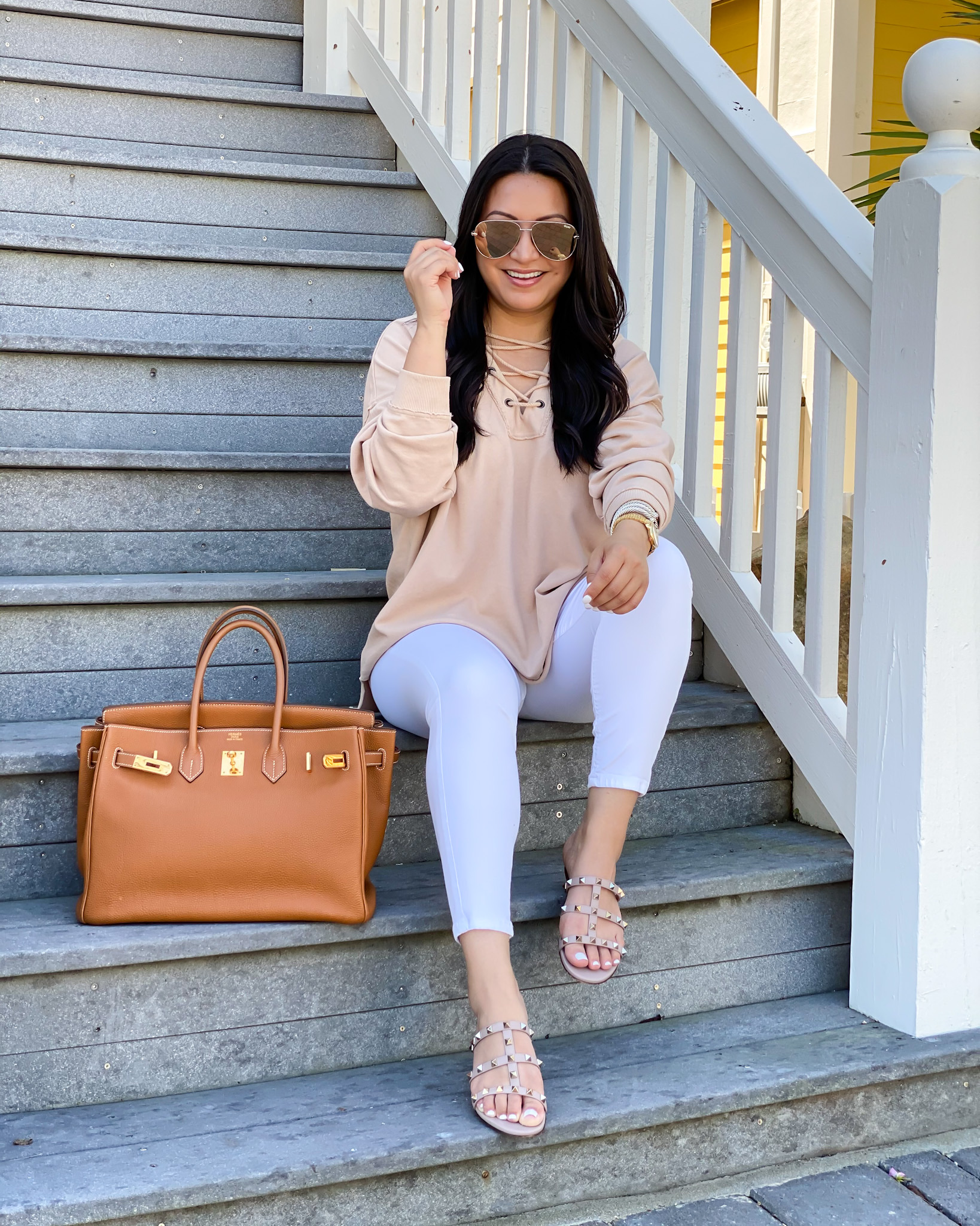 Top | Jeans | Valentino Sandals | Watch | Bracelets | Sunglasses | Handbag