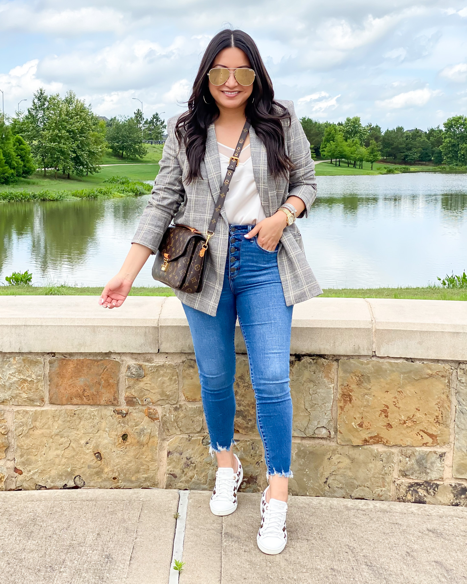 Top | Jeans | Blazer | Watch | Bracelets | Earrings | Sunglasses | Sneakers | Handbag