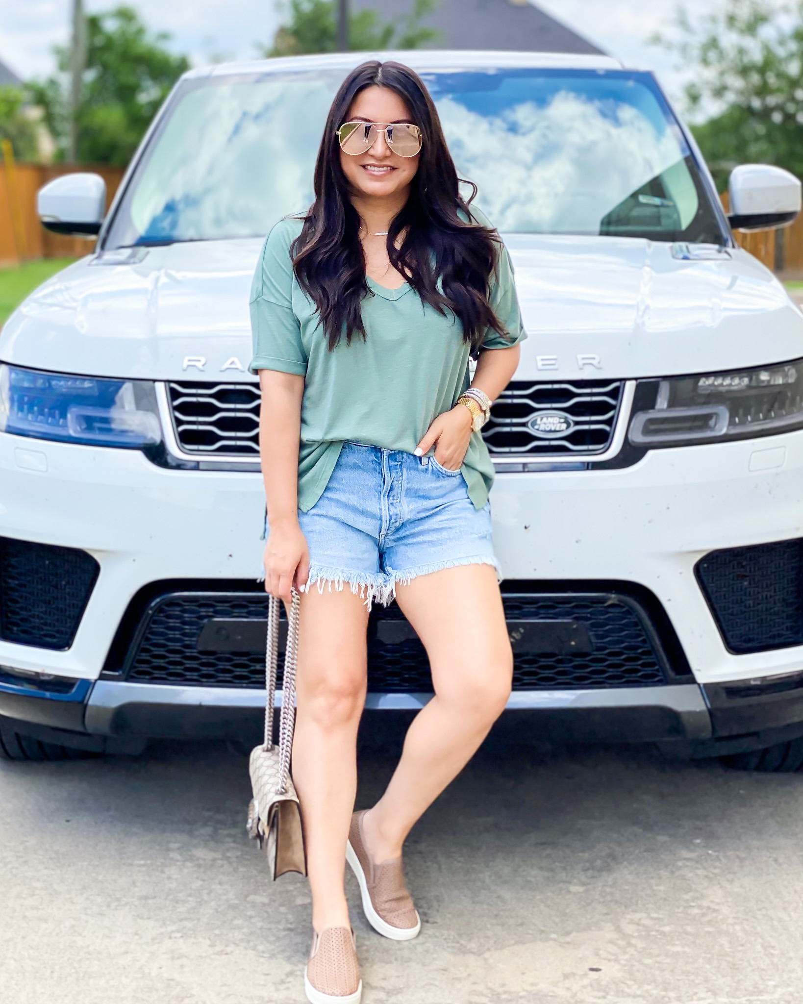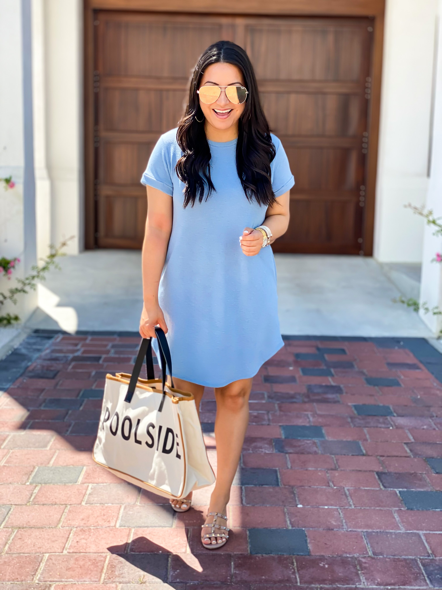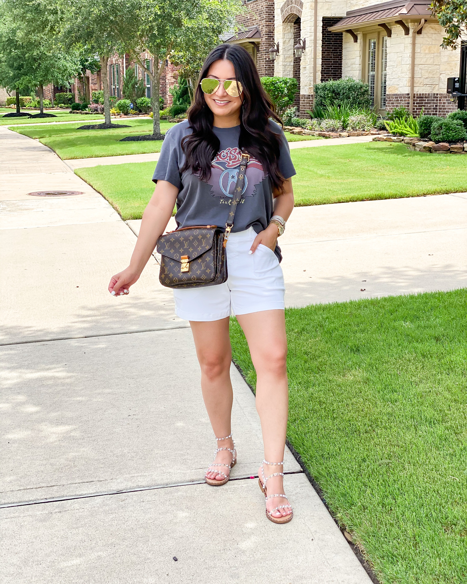 Tee | Shorts | Sandals | Watch | Bracelets | Earrings | Sunglasses | Handbag