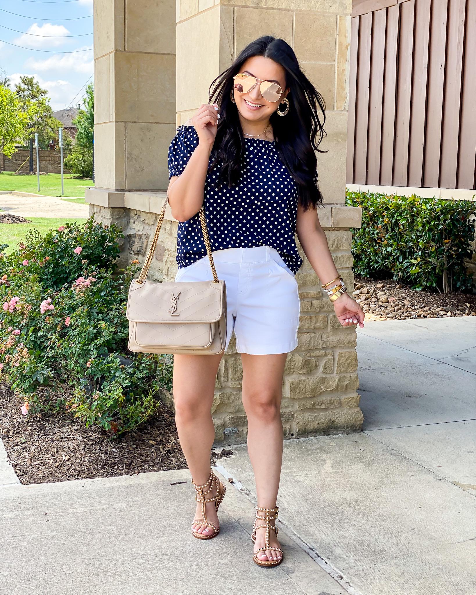 Blouse | Shorts | Sandals | Watch | Bracelets | Earrings | Necklace | Sunglasses |Handbag