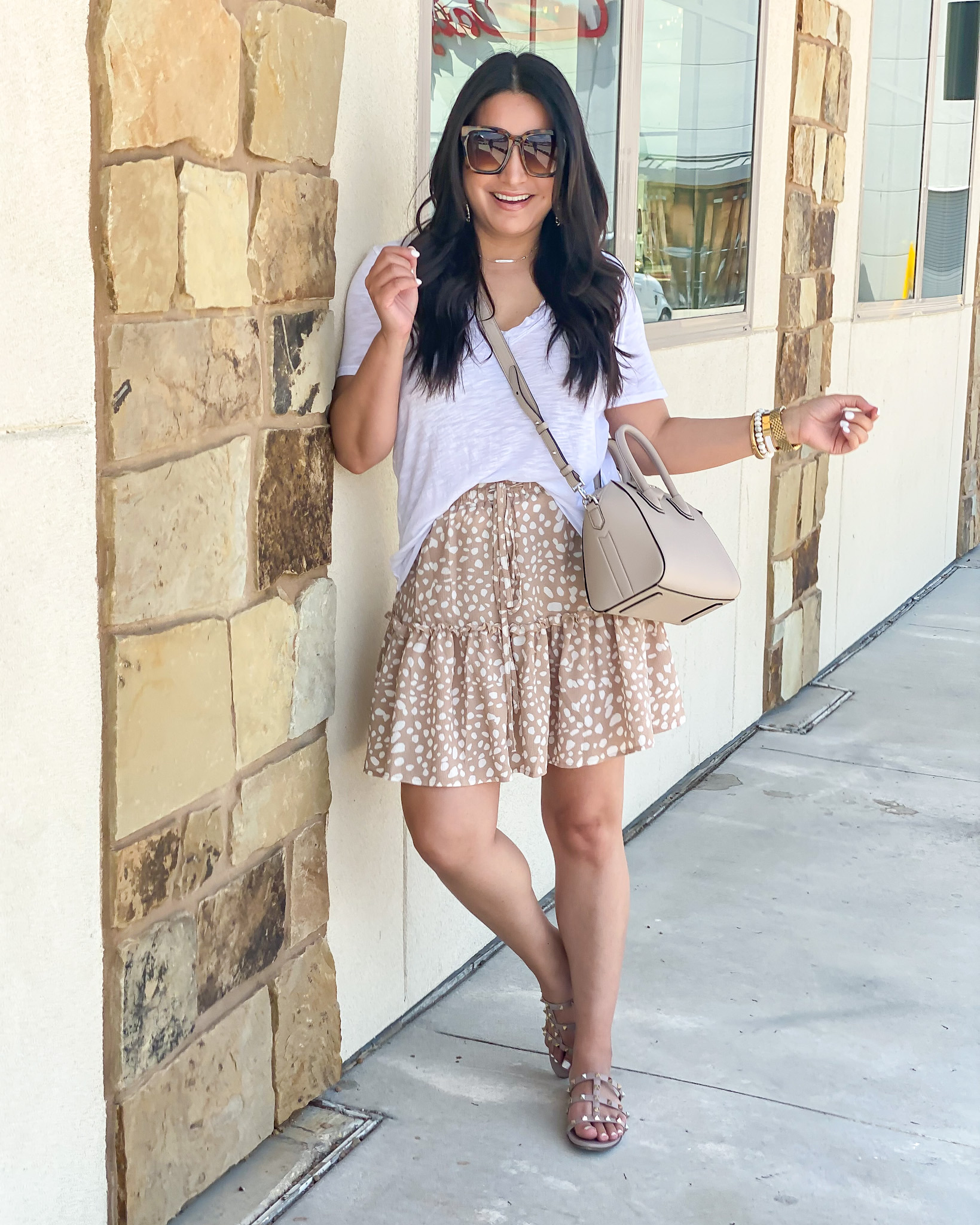 Tee | Skirt | Valentino Sandals | Earrings | Watch | Bracelets | Necklace | Sunglasses | Handbag