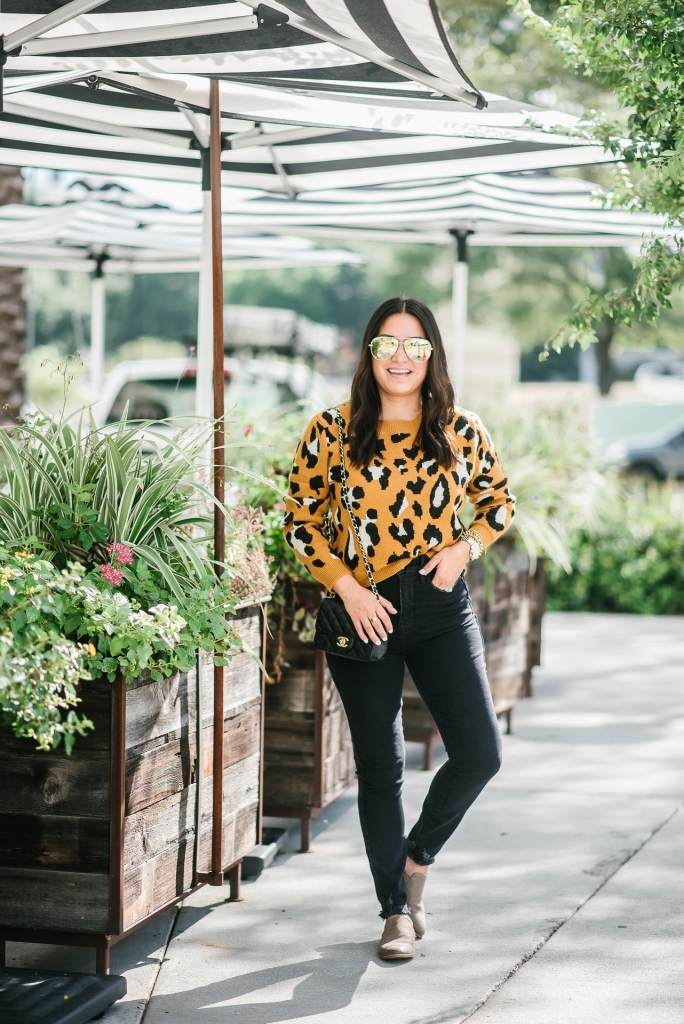 Are you tired of leopard yet? I hope not cause I have so much more to share. When I found this sweater I knew y’all would love it. Leopard on a budget but it’s still so soft. It does run a little small. I went up to a medium hoping for an oversized fit and it fits normal. It paired perfectly with these high rise jeans which are so good. I love a good distressed denim but in black these are perfect for the upcoming season. Oh, and I have to mention this lock bracelet. It’s a new fav of mine. You know I love my stacks.