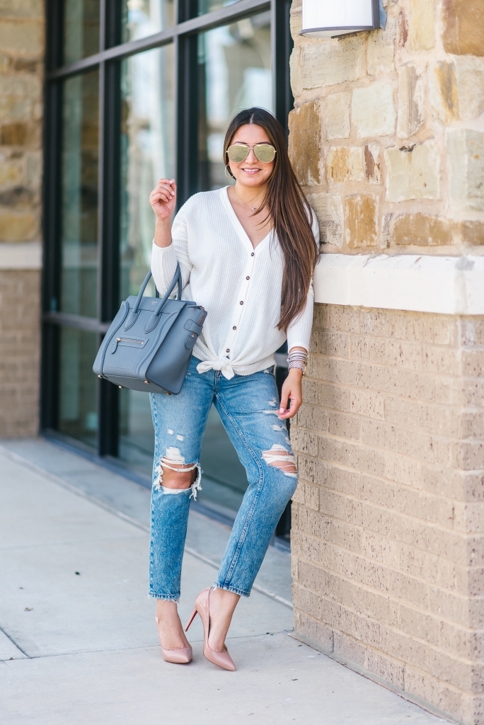 I love mixing high and low when it comes in fashion and this couldn’t be a more perfect example of that. This top is $15, the jeans are on sale for just over $60 and the shoes and bag are the high in this equation. I’ve actually been wearing this shirt a ton, you’ve seen it before but I wanted to share it once more before it’s sold out. Also, if you love the jeans but want a less holey version they have them here.