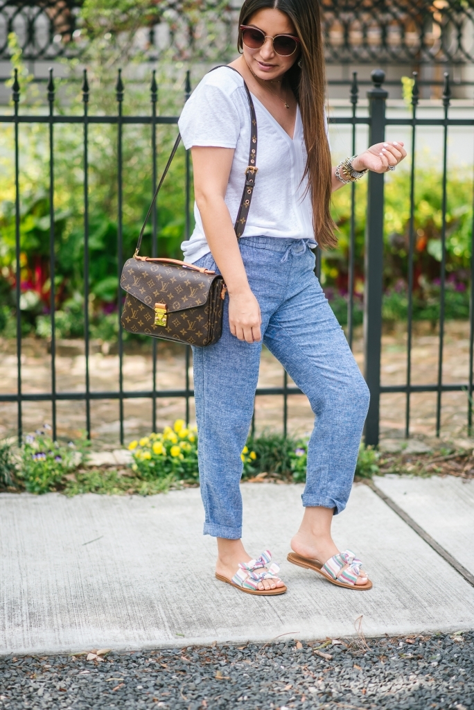 I had so share these must have linen pants with y’all. I’ve already added 3-4 four pairs this season, but these are my favorite. Plus, they are only $40, so you can grab more than one if you want. They are perfect for grab and go, but could be pulled together a little too. Whatever your style this is just great to have all season long. I love them in this chambray, but they do come in a blue stripe too, which I also love. Also, how cute are these tie sandals?!? I love them in this multi-color but they also come in several solids if this is too much for you. Oh, and they are currently on sale for $17, hurry, before they are gone.