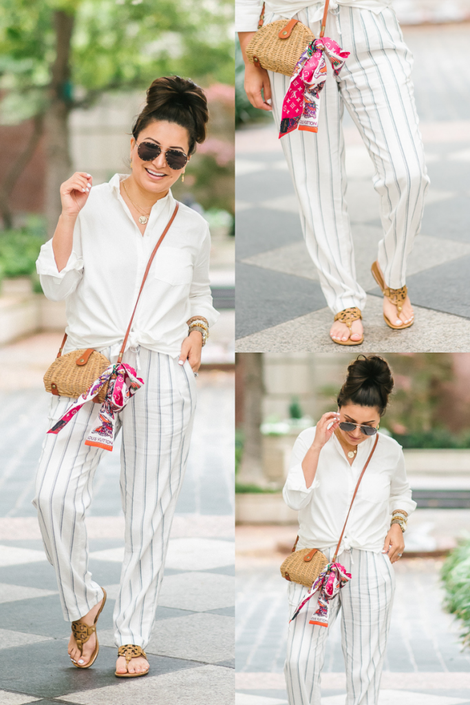 This was a fun outfit for me. It’s actually a swimsuit top, which is crazy I know, BUT I wore this to the pool party…so it worked, lol. These pants are seriously everything and UNDER $50. I am wearing a small and they are not only comfortable but the length is perfect. On another note, if you haven’t purchased this handbag yet….you need it. Mine is the size small and so fun for spring/summer.