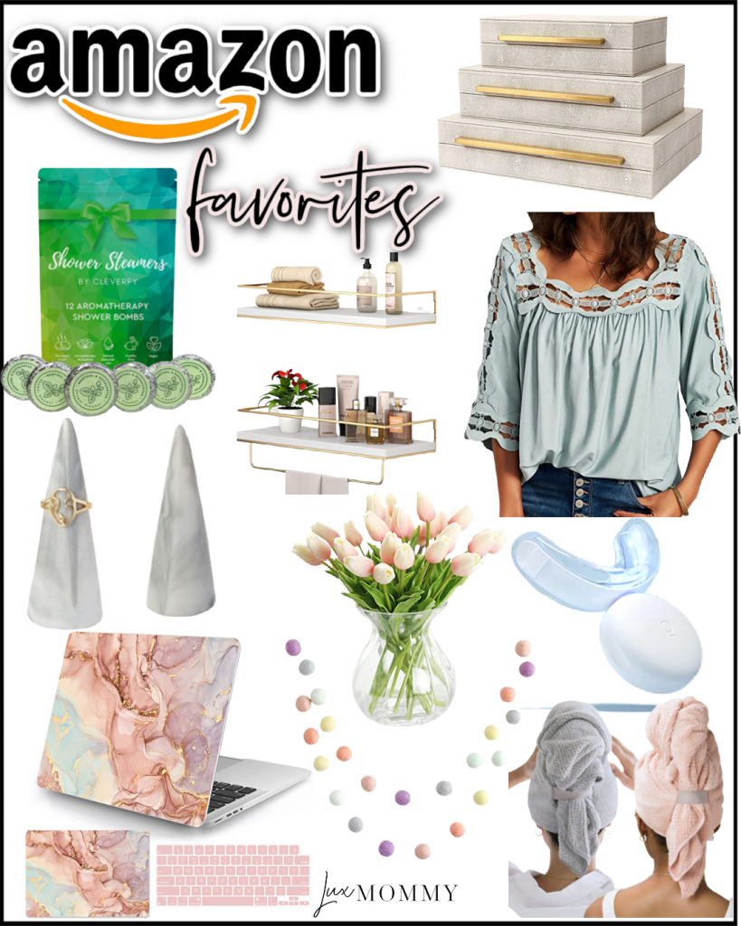 All my Amazon junkies let’s talk Amazon favorites!! These hair towels have been a new favorite, they are so good and super comfortable. I also stocked up on these shower steamers, the eucalyptus is my favorite! I had to include my new laptop cover, the colors are so cute. Speaking of cute, this lace top was my favorite fashion find. These shelves were a big hit too and lots of y’all are using this teeth whitening light. It’s so good, I already see a difference. I started decorating for Easter and this ball garland and these tulips were perfect to decorate with. Another decor find were these stacking boxes, they are so nice and look very expensive. They might be one of my all time favorite Amazon decor finds. Last up is this 2 pack marble ring stands. They are so cute but also super practical. Shop all my favorite Amazon finds below!