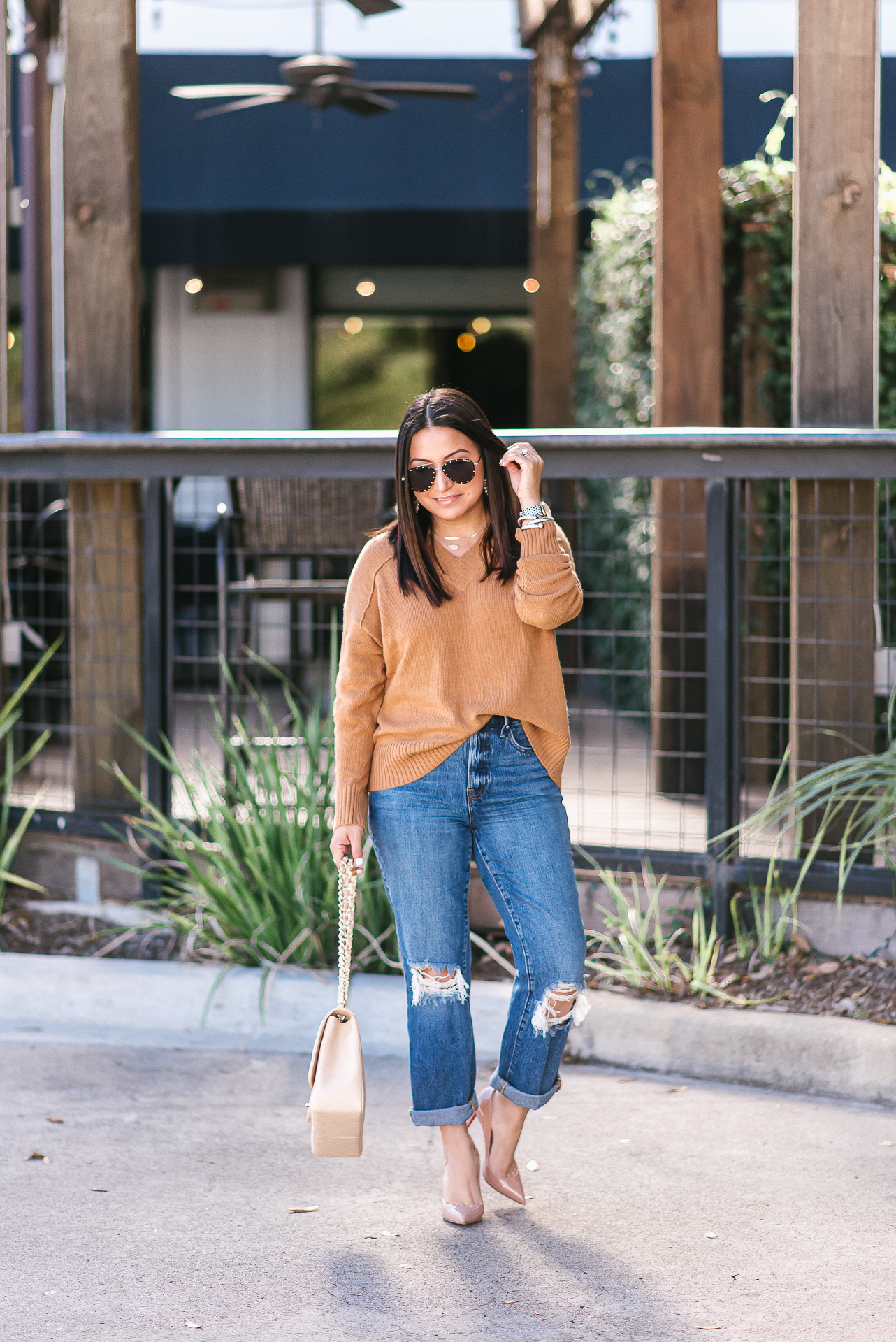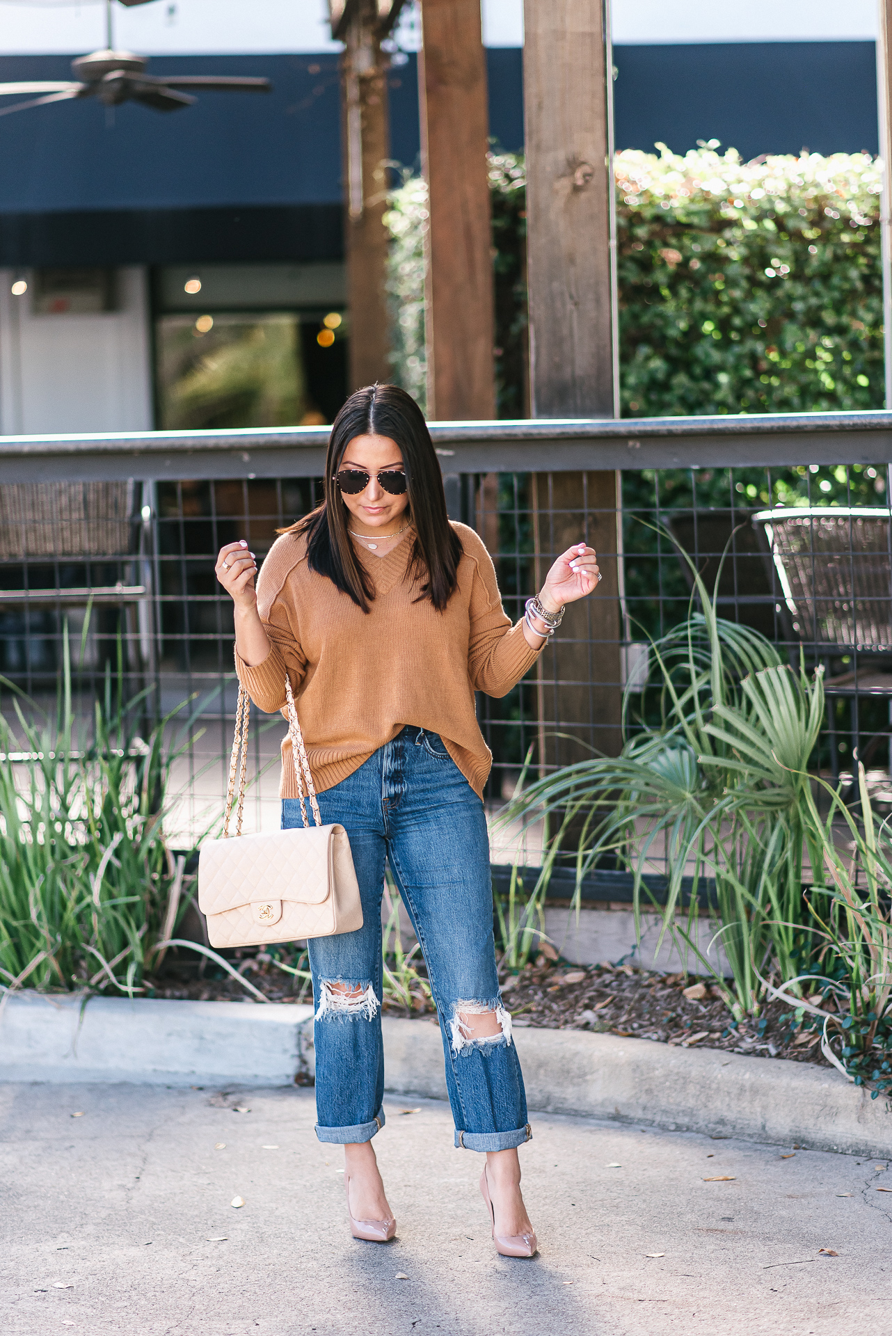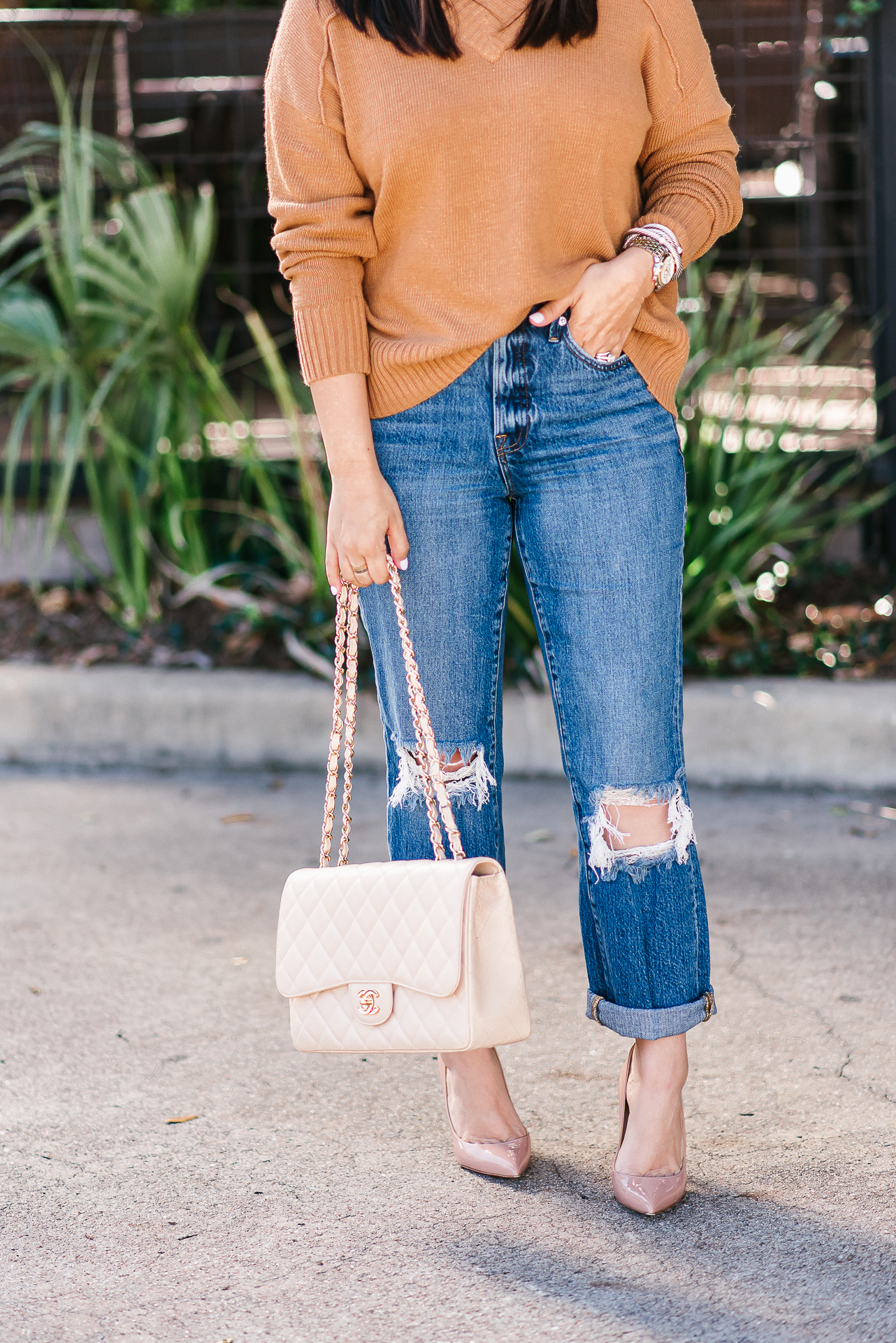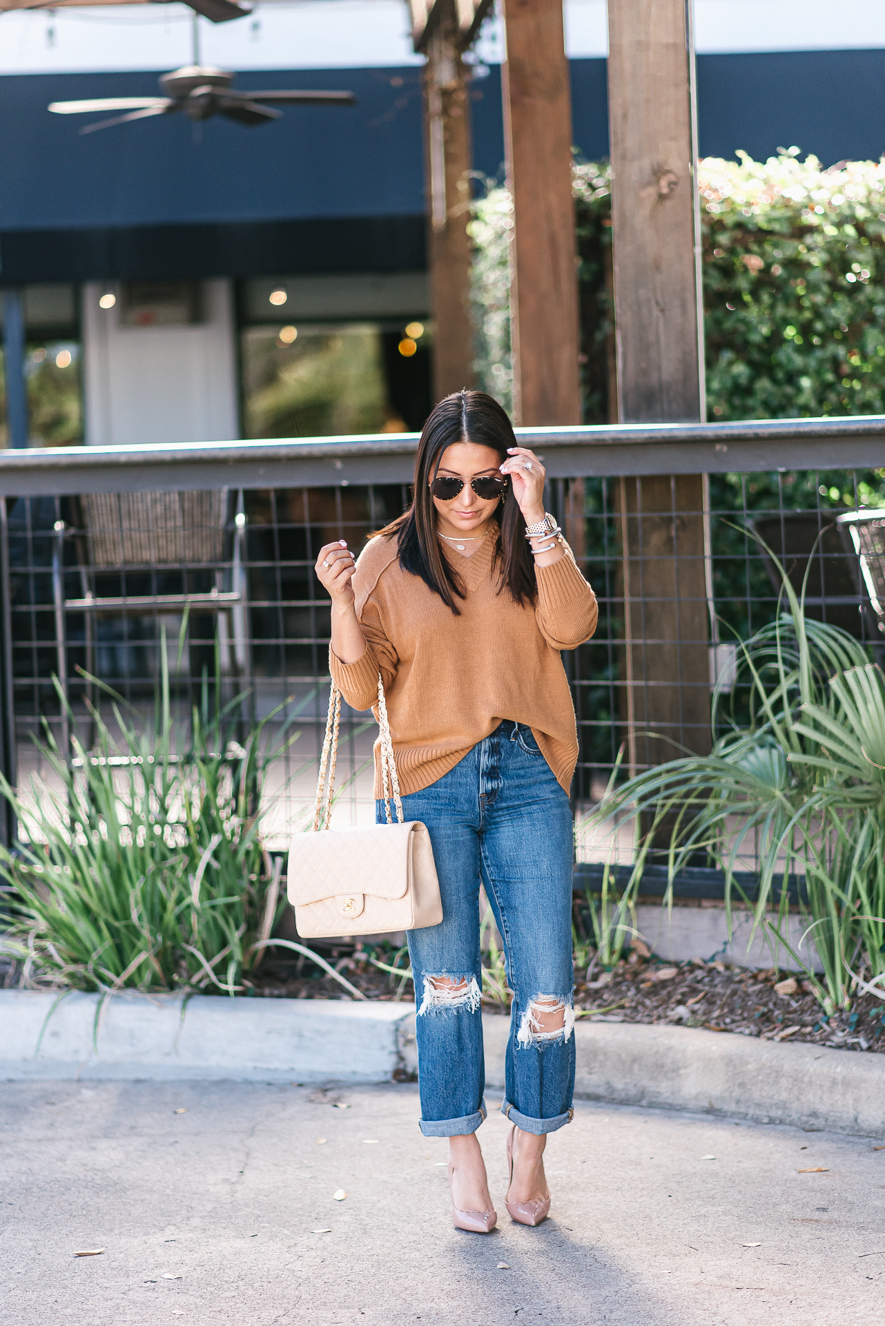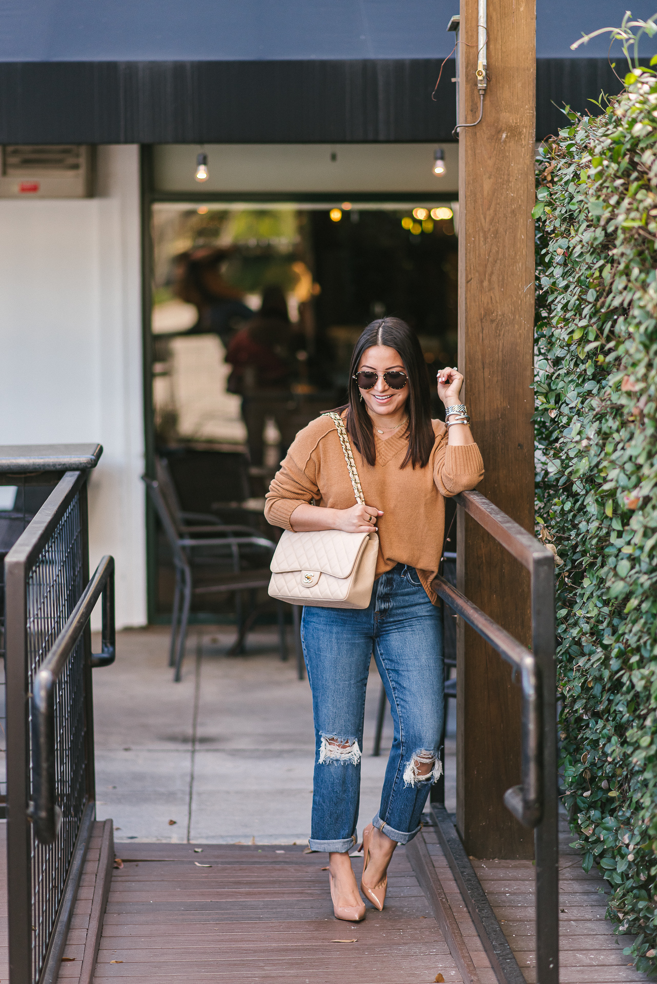 I’ve been living in sweaters lately and this one is so softest sweater ever. It just feels amazing and is so flattering. As you can see, it runs really big. I am wearing a small and it’s oversized but in a very flattering comfortable way. I’d go down a size or even two if you don’t want an oversized fit. It comes in 3 colors! I am loving the red. Speaking of love….eeekkkk….this bag!! I am in love y’all. I will be honest, I wasn’t sure what to expect. I knew I loved the bag but I wasn’t sure how practical it would be. I was so off. It’s so perfect for me. With that said, mine is the single flap which I feel like makes a huge difference. I could definitely see adding another jumbo, but I think I will stick with singles in this size.