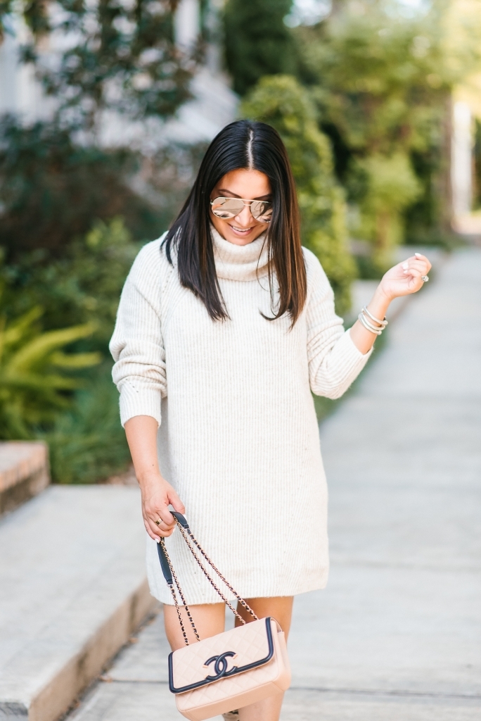 Sweater Dress – XS | Booties | Sunglasses | Bracelets | Handbag