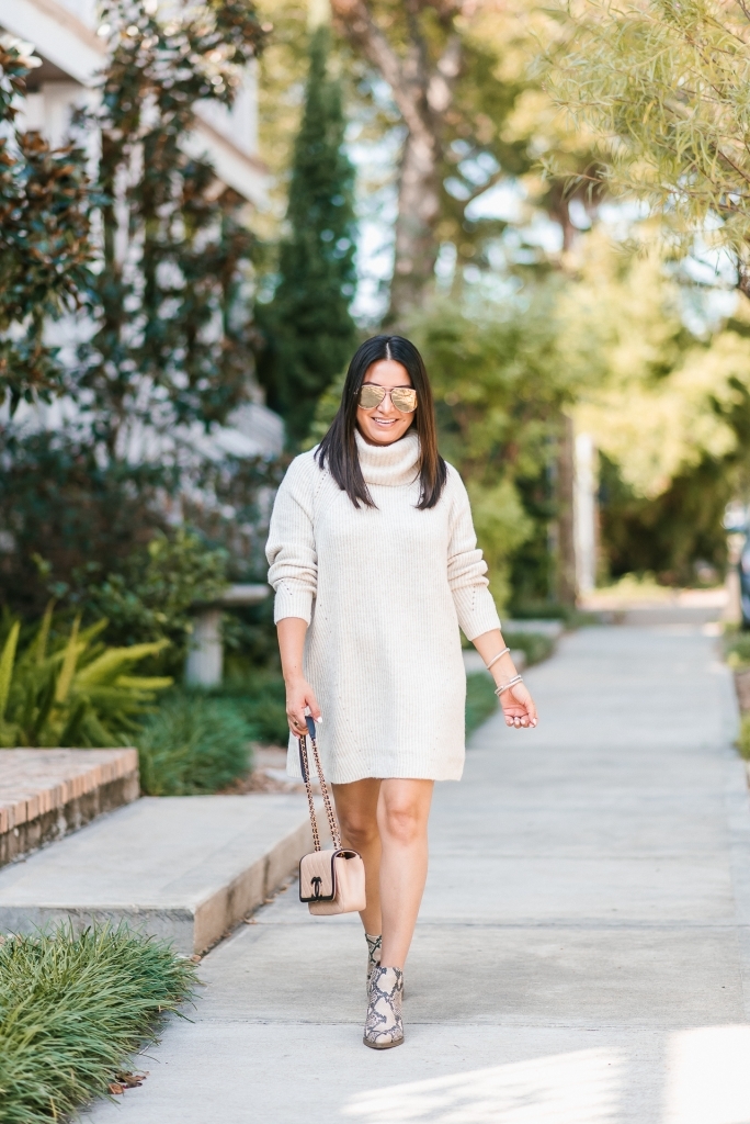 Fall weather is inching in y’all and I am so excited. Every year I search high and low for a sweater dress and I am not always successful but this sweater dress is it. The sweater dress of all sweater dresses. The proportions, the turtleneck….it’s so good. It comes in 4 colors. I can totally see it with sneakers and a cross body for a more casual look. I am thinking Holiday parties too. It’s just a good one y’all. Oh and it’s not itchy at all.
