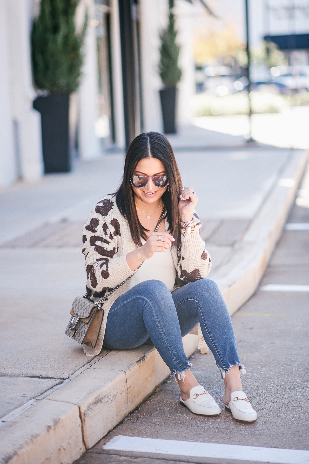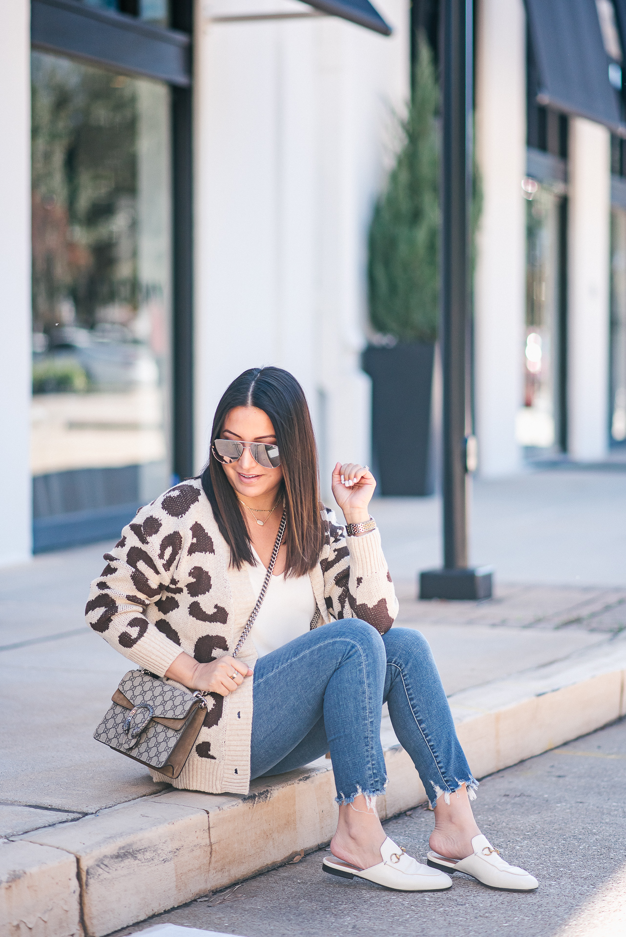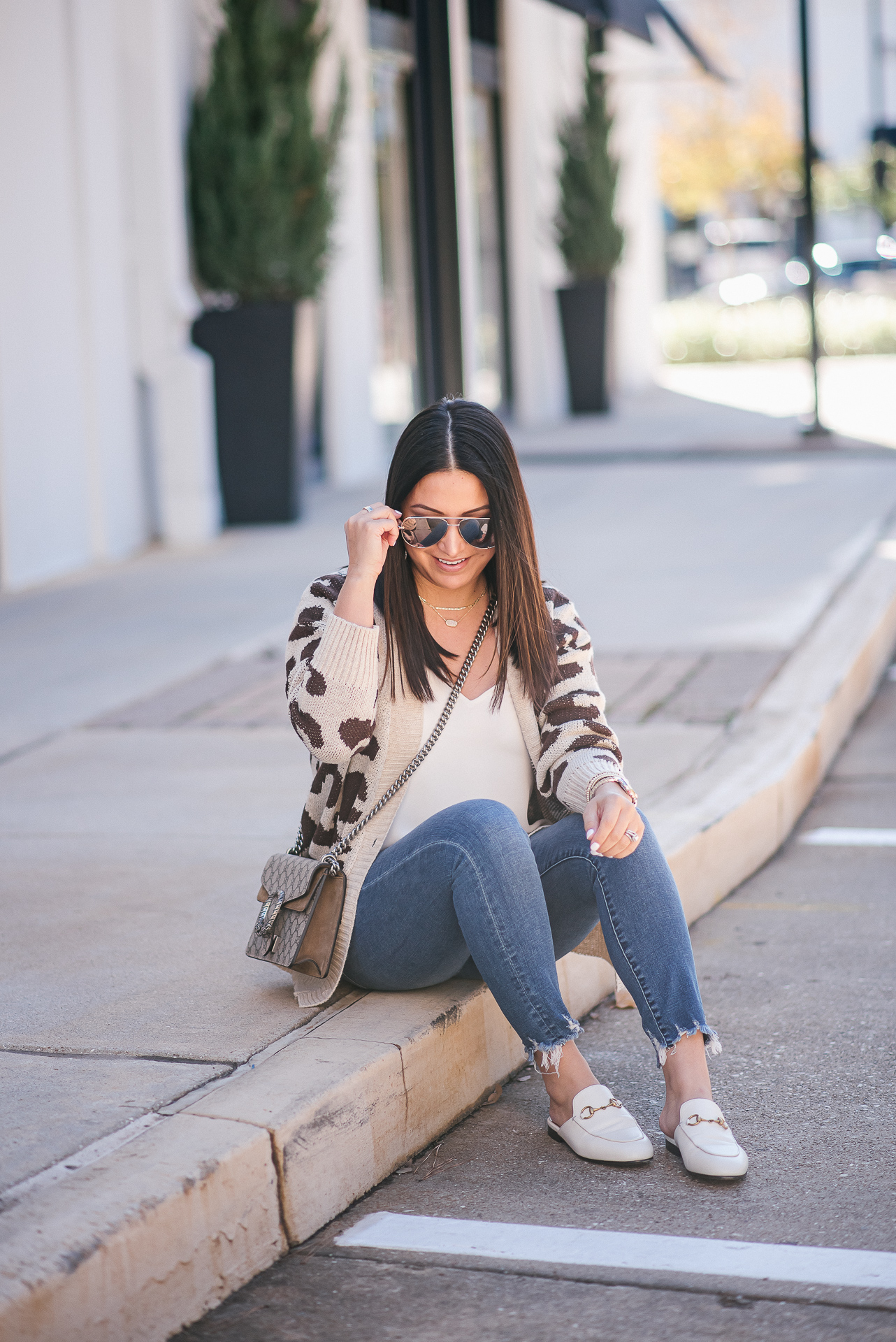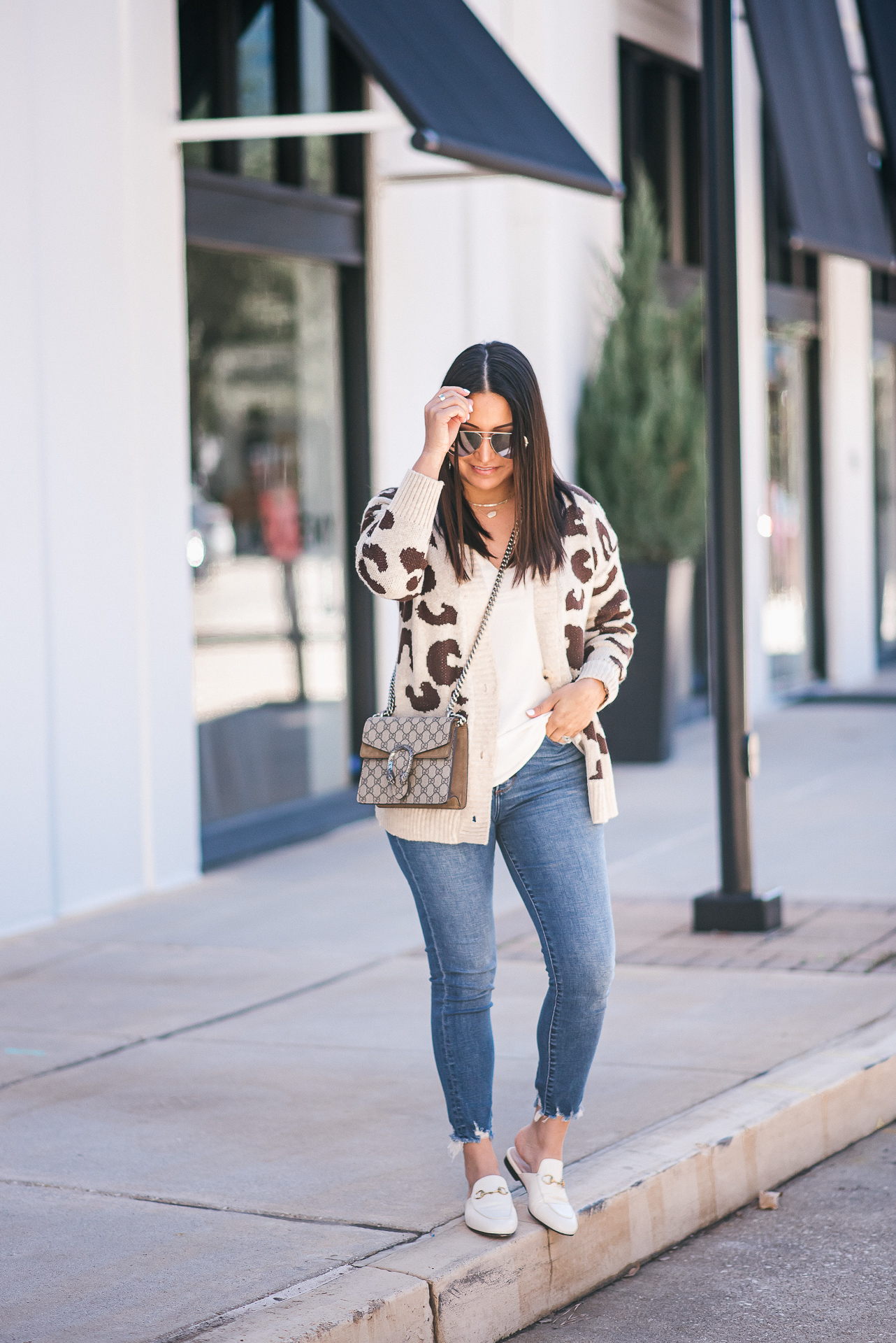 Hey there! I hope y’all are having a great week! We are halfway to the weekend and I cannot wait. We are hoping for some nice weather after the rain and temperature drop we had last weekend. I’m so in love with this today’s outfit. This leopard print cardigan is seriously the cutest! The colors are a more neutral and muted leopard print but I love it. It comes in three other colors as well. You could wear this so many different ways, like with leggings for a more casual look. I layered a super simple cami under the cardigan. This cami comes in so many colors! I have it in four colors. It is perfect for those days where it is chilly but not freezing cold. The wash of these jeans is such a perfect blue. They have my favorite hem. The loafers give it a more polished look and the white looks so fresh with denim! I added my current fav Kendra Scott necklace. I love a good layered necklace. Pair it with your favorite handbag and you have the cutest look!