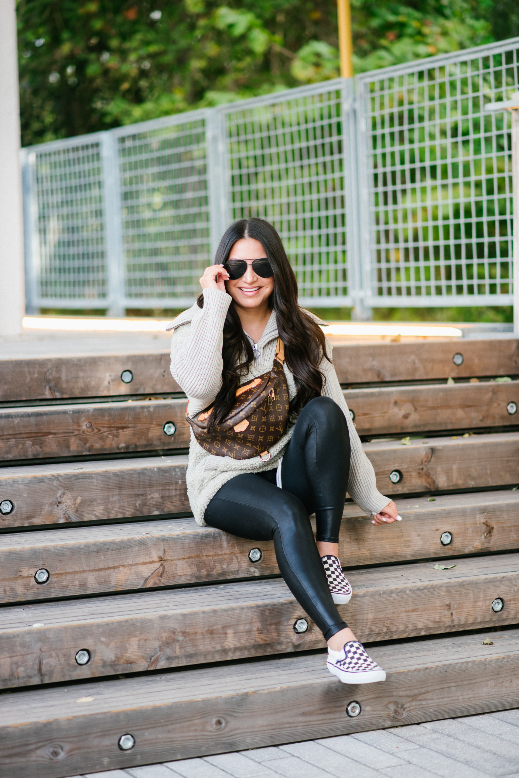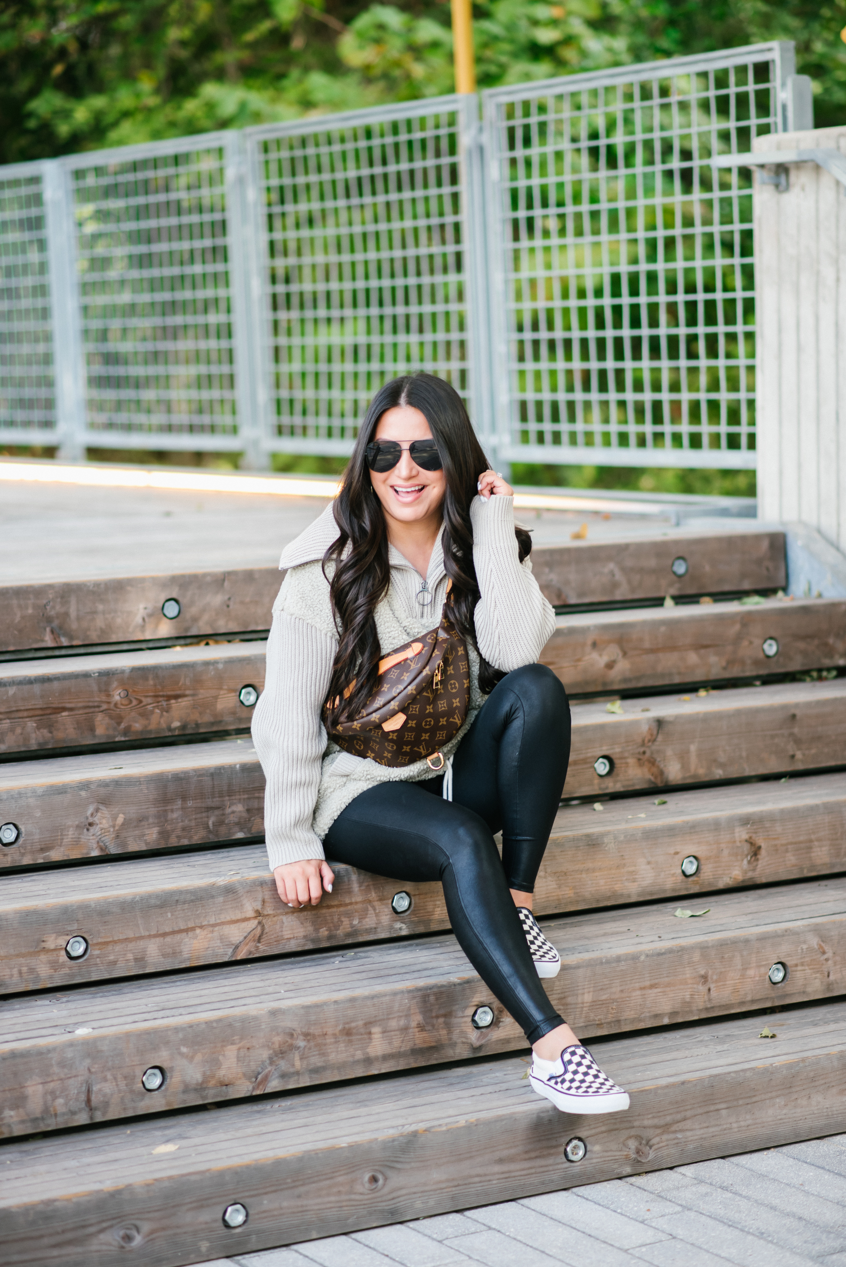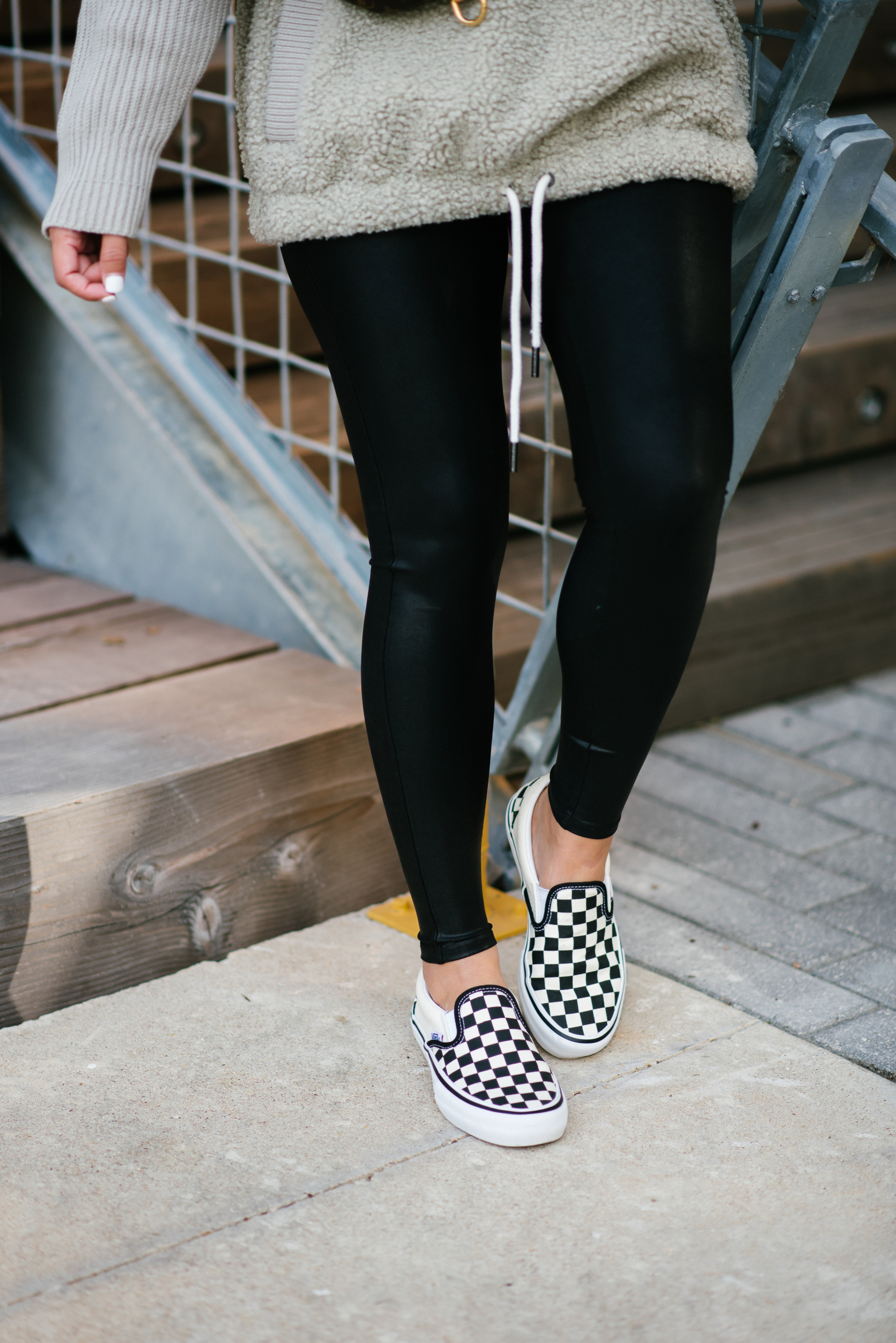 I’ve been all about the cozy casual lately, who else?! It’s been a little chilly, so a comfy pullover is just what I needed. This pullover is so soft and who doesn’t love a little teddy action. You can wear it zipped open and loose or zip it up for a little extra warmth around the neck. I added my fav faux leather leggings. I’ve got about 6 pair at this point, I live in them year round. These sneakers have been a go to recently for me. I will say, they did need a little breaking in but they are super comfy now.