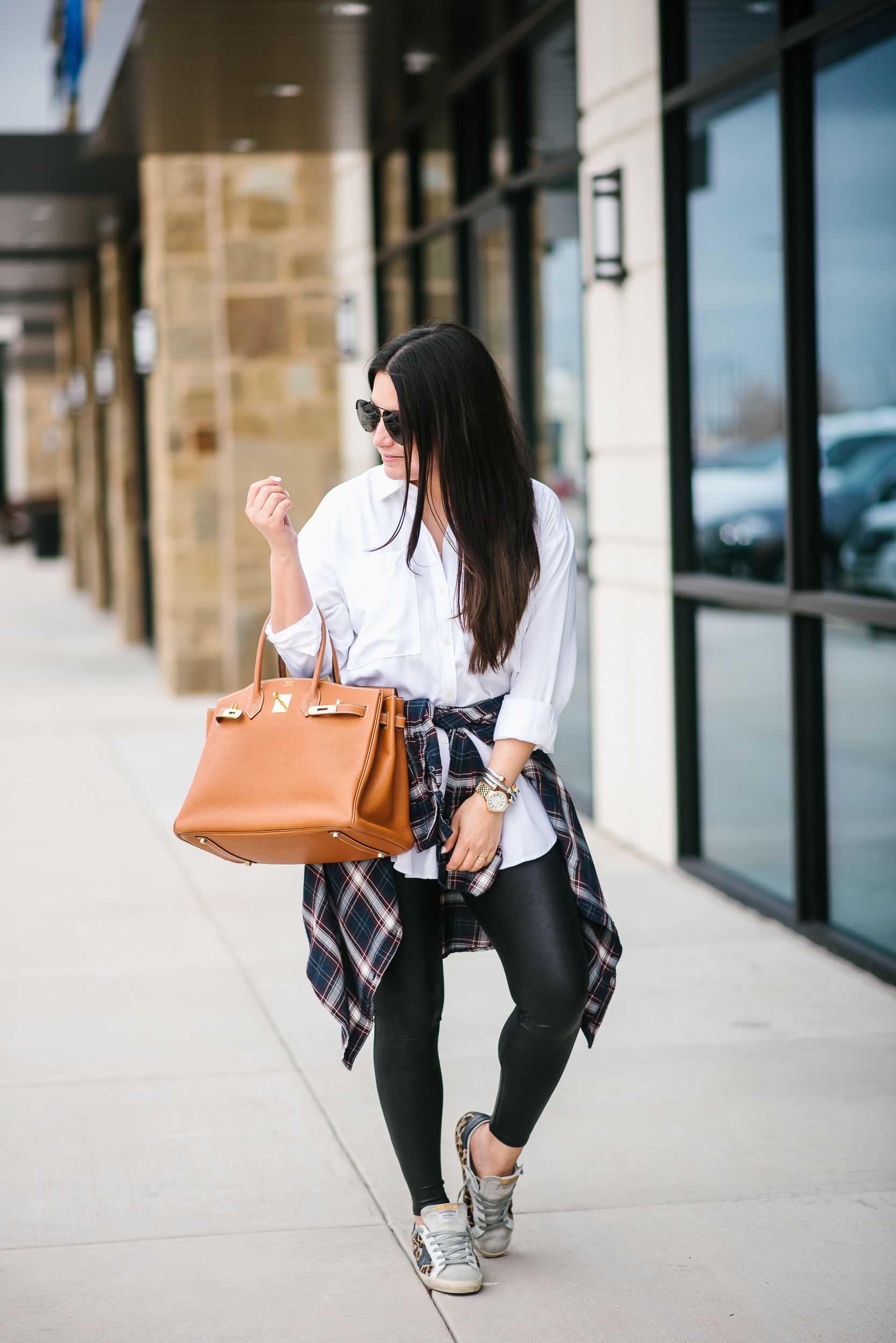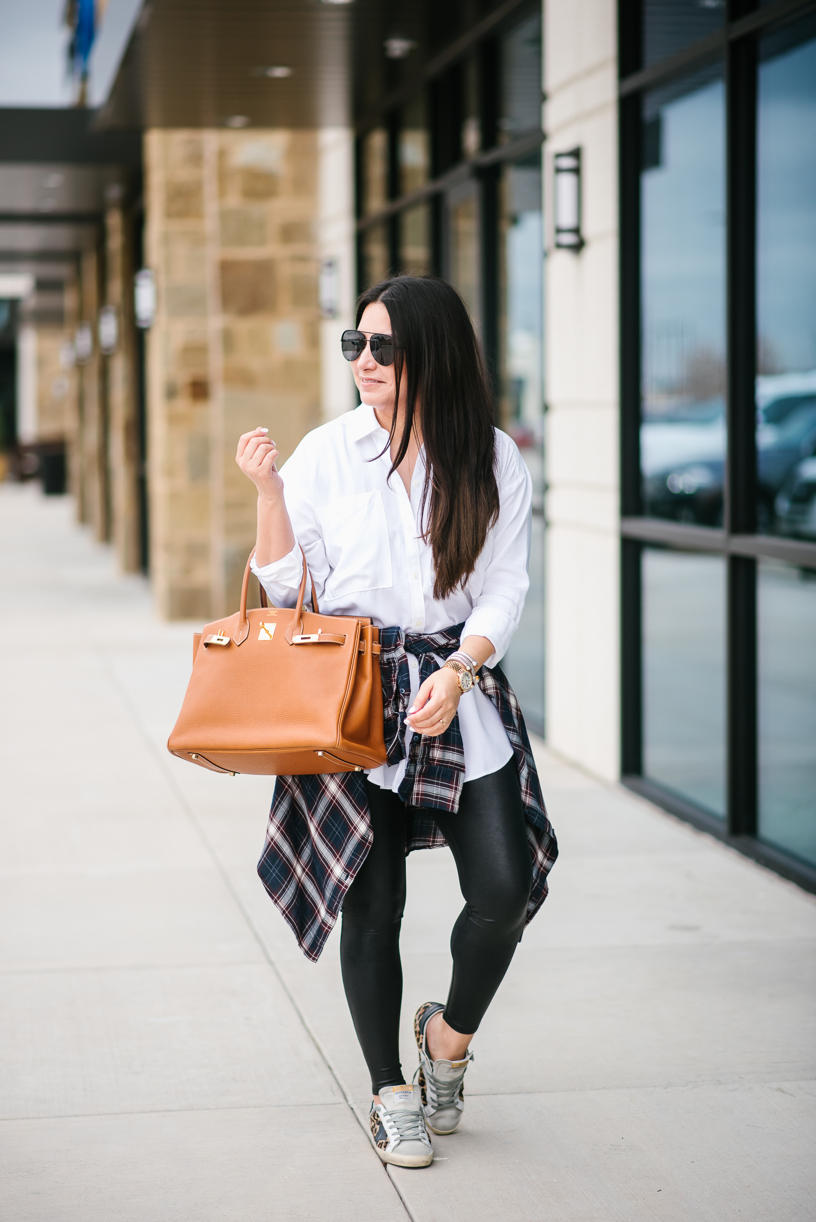 Button Down top – small | Flannel – small | Leggings – small petite | Sneakers – 36 | Sunglasses | Bracelets | Watch(similar) | Handbag