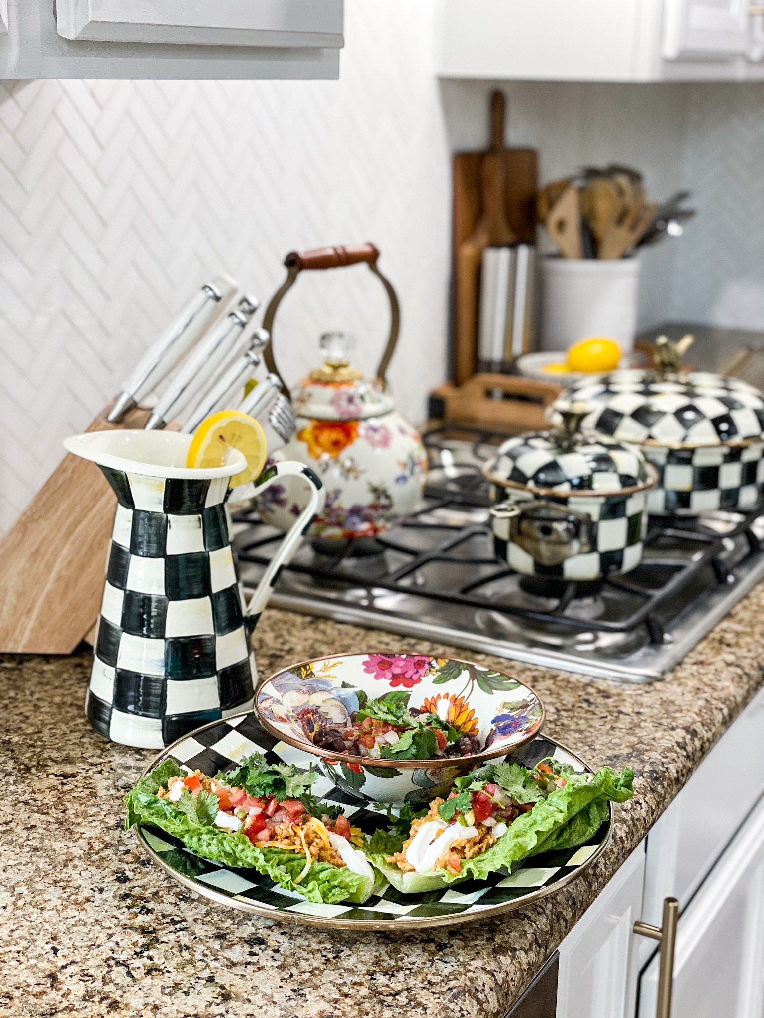 I am so excited about today’s post. I’ve received an overwhelming response to share more easy recipes but I also get to share some of my new MacKenzie-Childs pieces with you. I have fallen so in love with the MacKenzie-Childs brand. Not just the actual pieces, they are pretty incredible but the brand itself. A couple of months ago I was able to attend a blogger event sponsored by MacKenzie-Childs and was able to dive deep into the culture of the brand. I was able to see first hand one of MacKenzie-Childs artists painting and sharing the techniques that they use to create these one of a kind pieces. To say that MacKenzie-Childs is just home decor and plates, would be unjust. It’s a culture, it’s a lifestyle and it’s something that is not hard to fall in love with once you are introduced to the brand. I’ve already have several of you reach out to me once I started sharing MacKenzie-Childs to share your personal collection. I am excited to share some of my collection with you too.
