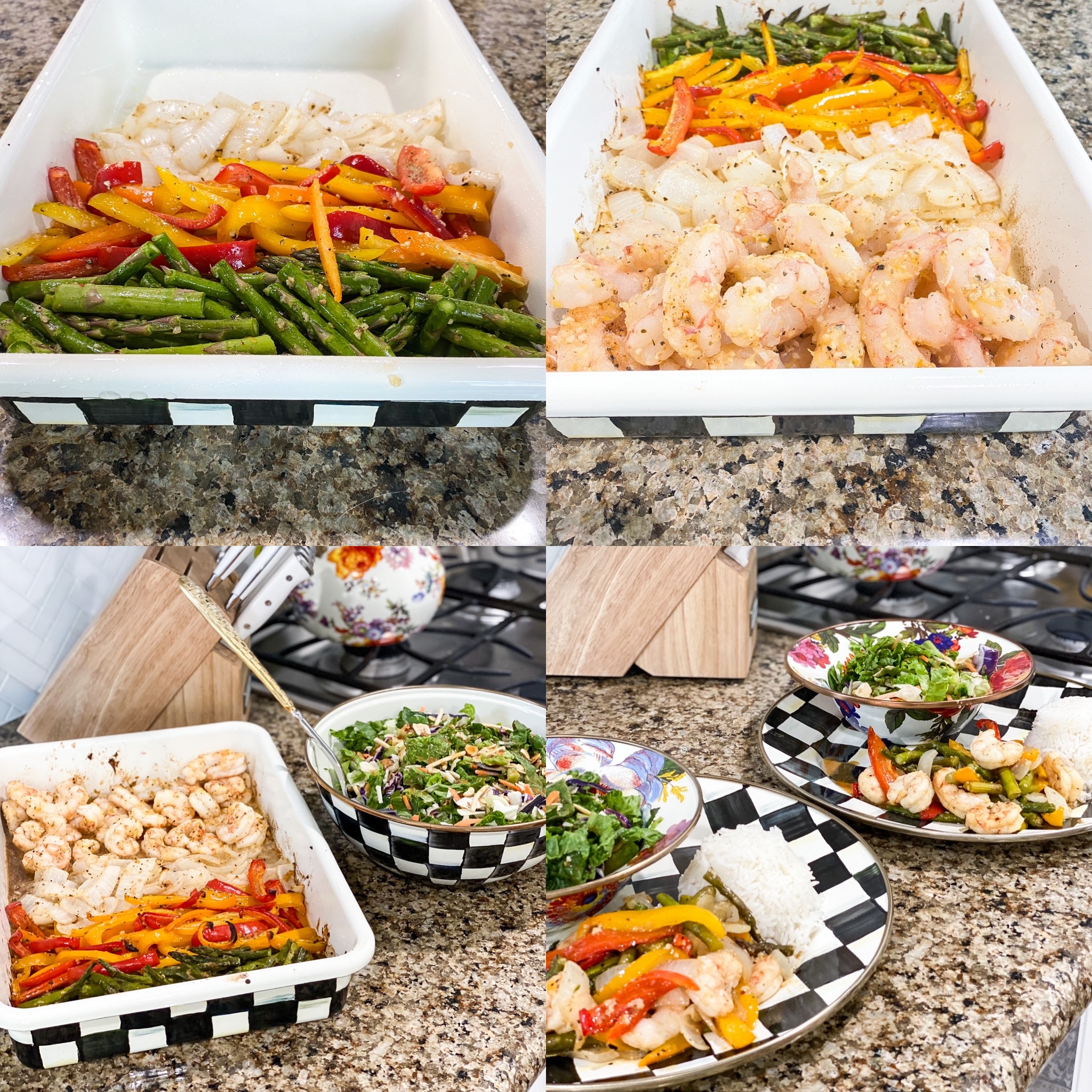For One Pan Meal: shrimp, peppers, onion, asparagus, garlic, oil, seasoning of choice.