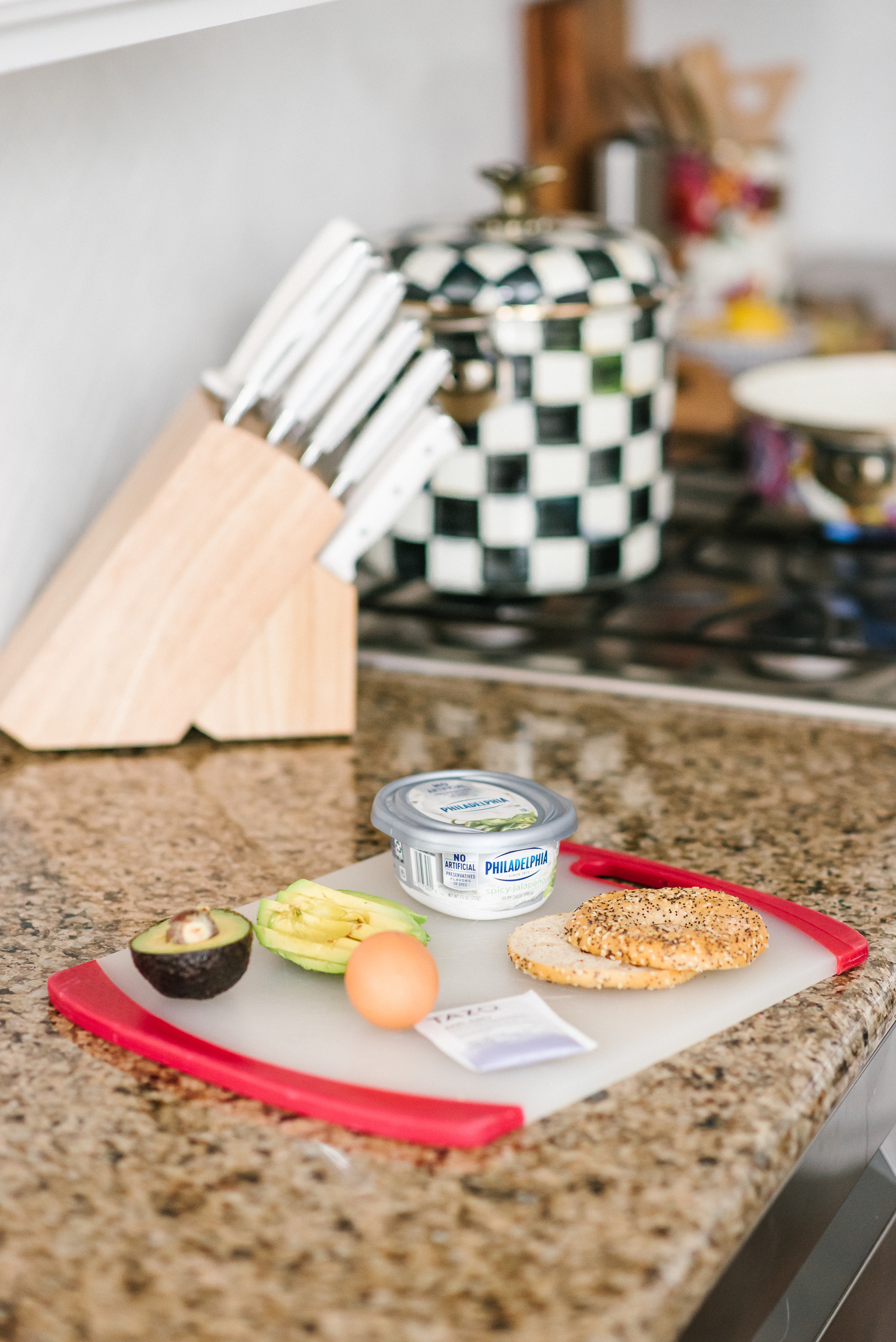 For Sandwich: egg, 1/2 avocado, cream cheese of choice(I like jalapeño), seasoning of choice(I like everything bagel), bagel(I use a sprouted thin bagel).