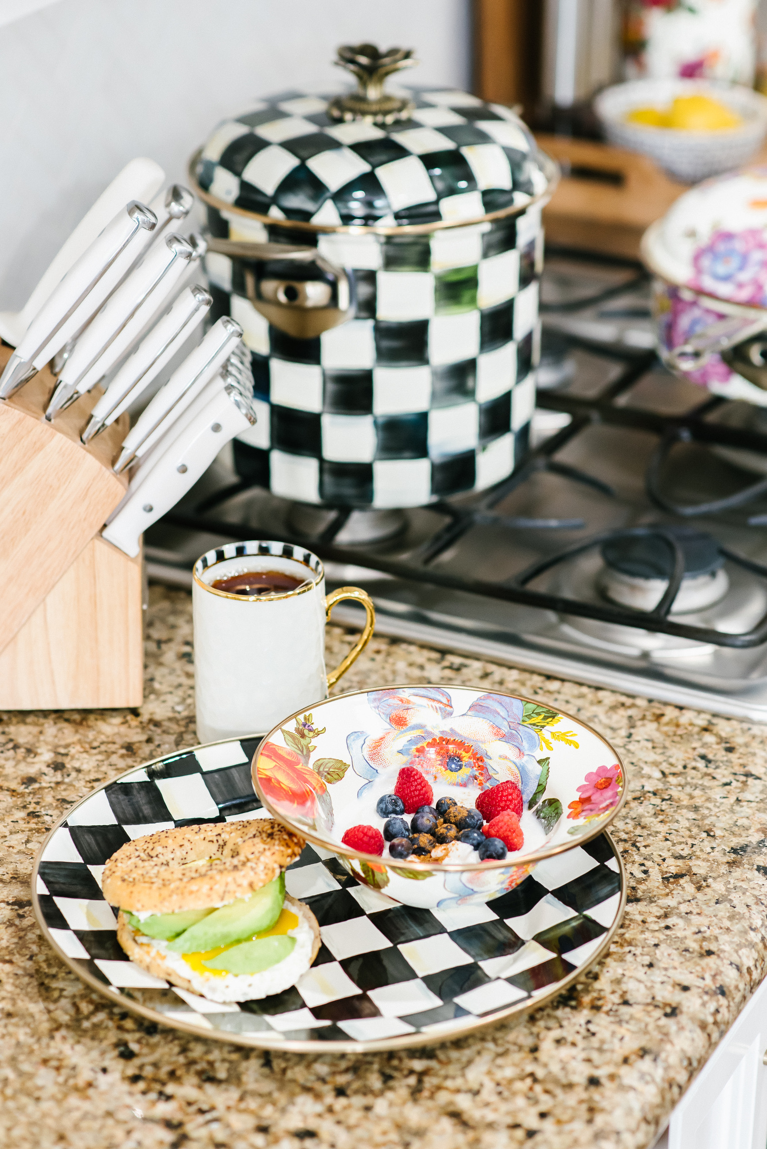 I thought it would be fun to partner a what I eat in a day but also share how we’ve been using my new MacKenzie-Childs pieces in our home. They really make meal time that much more special and I love that I am create a memory that my boys will remember when they are older. Check out what I ate in a day and some of my new pieces below.